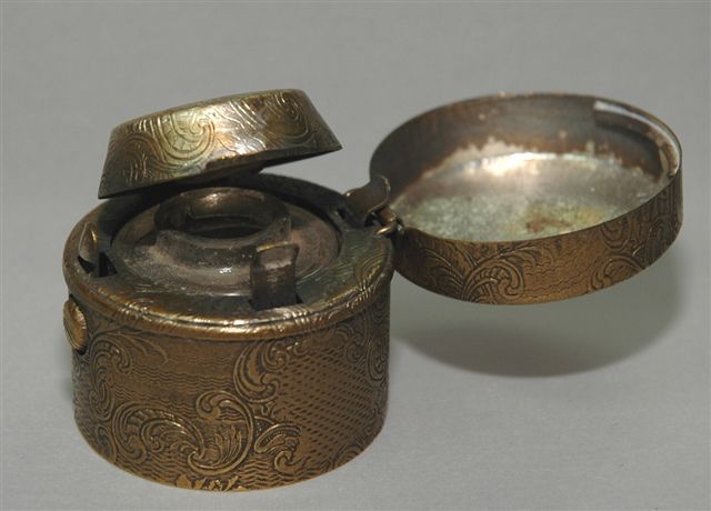 ENCRIER de VOYAGE dans un étui de forme cylindrique en laiton doré à décor ciselé et mascaron style Louis XV sur le couvercle Le couvercle est à charnière avec ouverture par bouton poussoir. L'intérieur recèle le flacon encrier cylindrique en verre obturé par un fermoir bouchon à système de cliquet.
