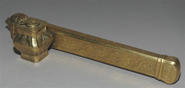 ÉCRITOIRE de VOYAGE d'origine persane sous forme d'un étui en bronze à décor ciselé, sa forme permettait au scripteur de le glisser dans la ceinture. Ce nécessaire est composé de deux compartiments l'encrier fixé sur le côté et la partie longue de l'étui prévue pour le bâtonnet d'encre, le grattoir et la plume d'oie.