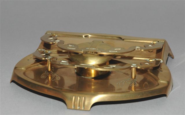 ÉCRITOIRE en laiton doré Art Nouveau avec un porte godet à couvercle charnière sur plateau plumier en avant d'un dosseret fait de deux arches rabattables faisant range lettres et repose plume. Marquage GES. GESCH. Pour GESCHUTZ.