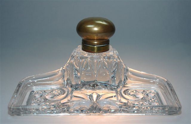 ENCRIER plumier en cristal de BACCARAT. De forme rectangulaire le plateau plumier présente en son centre le porte godet encrier cubique fermé par un bouchon charnière laiton doré. Marqué en relief BACCARAT DEPOSE. à l'intérieur du plumier.