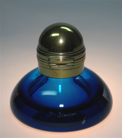 ENCRIER en CRISTAL de Lorraine soufflé. De forme lentille coloris bleu, l'embouchure reçoit un bouchon boule en laiton doré à double charnière. Il porte la signature du créateur, ST SIMÉON gravée sur le cristal et sur l'anneau de l'ouverture.