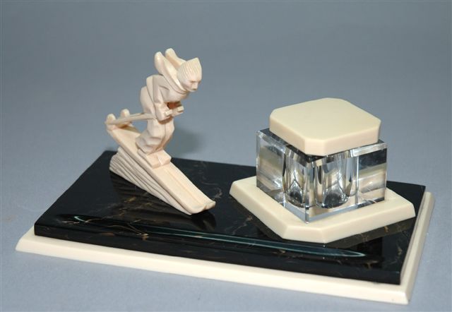 ENCRIER Art Déco, inspiré par les sports d'hiver alors en vogue, élaboré en ivoire, marbre noir et cristal pour l'encrier cubique fermé par un bouchon ivoire