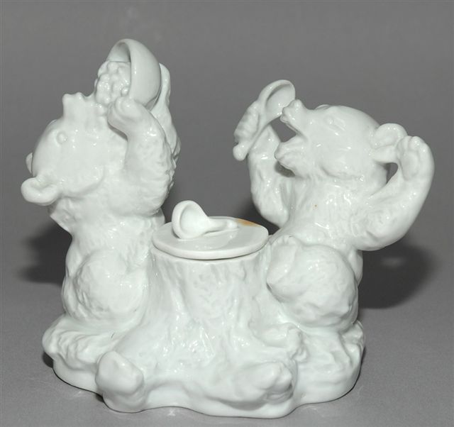 (ALLEMAGNE). ENCRIER en PORCELAINE vernissée à sujet animalier. Les deux oursons sont attablés autour d'une souche qui contient le godet encrier dont le dessus de cette table improvisée sert de bouchon dont la prise est une cuillère. En fait celle de l'ourson gourmand qui s'est emparé du bol de fruits pour l'engloutir au grand dam du second qui manifeste son désaccord. A la base, les excroissances de ce tronc font deux ergots repose plume. Au revers il porte une marque dont on devine une couronne.