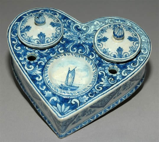 (PAYS-BAS). ENCRIER en FAÏENCE, forme de cur pour deux godets encriers avec bouchons et deux trous pique plume et un compartiment en creux pour plumes ou autres accessoires. Le décor de Delft est d'une barque de pécheur en camaïeu de bleu sur couverte blanc laiteux.