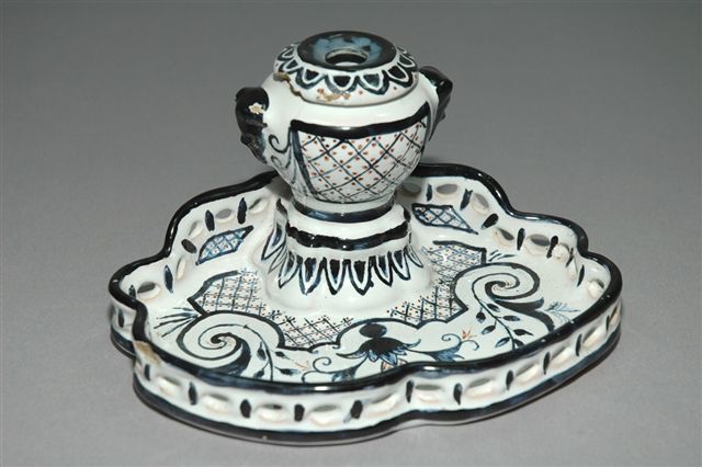 (PORTUGAL). ENCRIER en FAÏENCE, forme d'une urne pour un godet encrier sur piédestal posé sur l'arrière d'un plateau plumier polylobé à bordure balustre ajourée. Le décor combine les croisillons et les motifs floraux.