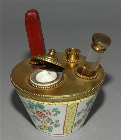ÉCRITOIRE en PORCELAINE forme de pot fermé par plateau laiton offrant les compartiments pour le godet encrier fermé par couvercle charnière, le sceau à cacheter, le bâtonnet de cire et un pique plume. Le décor est floral dans des espaces délimités par des bandes aux motifs craquelés.