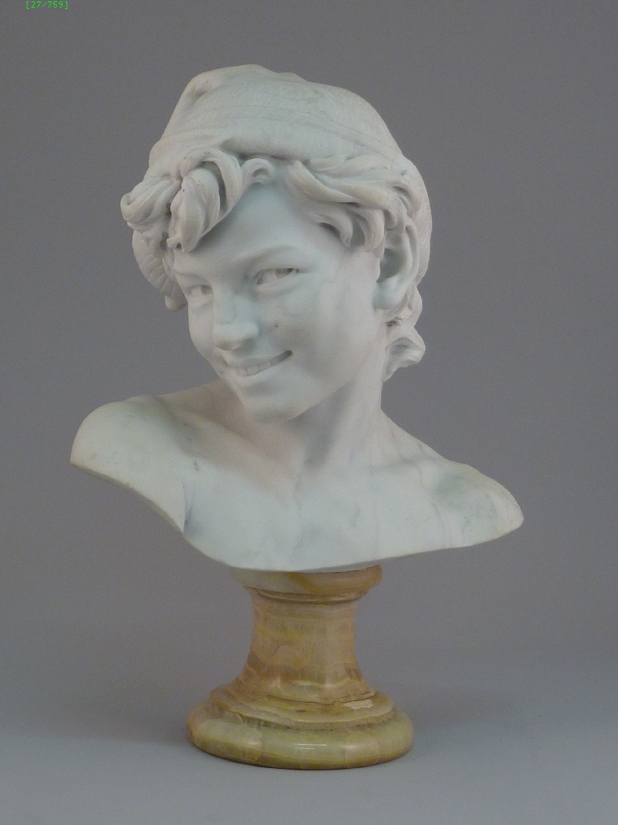 Séjournant en Italie, en tant que Prix de Rome 1854, Carpeaux part chercher l'inspiration à Naples. À l'automne 1857, il sculpte son fameux "Pêcheur à la coquille". Cependant, à Paris, loeuvre est quelque peu critiquée par lAcadémie, ce qui amène l'artiste à refuser de vendre son plâtre original à lÉtat. Il en fera fondre deux épreuves en bronze et en tirera deux bustes : "Le Rieur aux pampres" et "Le Rieur napolitain". Notre modèle ici en marbre a été exécuté d'après ce modèle original napolitain du Rieur. Ce sujet est pour lui loccasion de rendre hommage à son premier maître, RUDE, dont la mort, deux ans plus tôt, la profondément marqué.