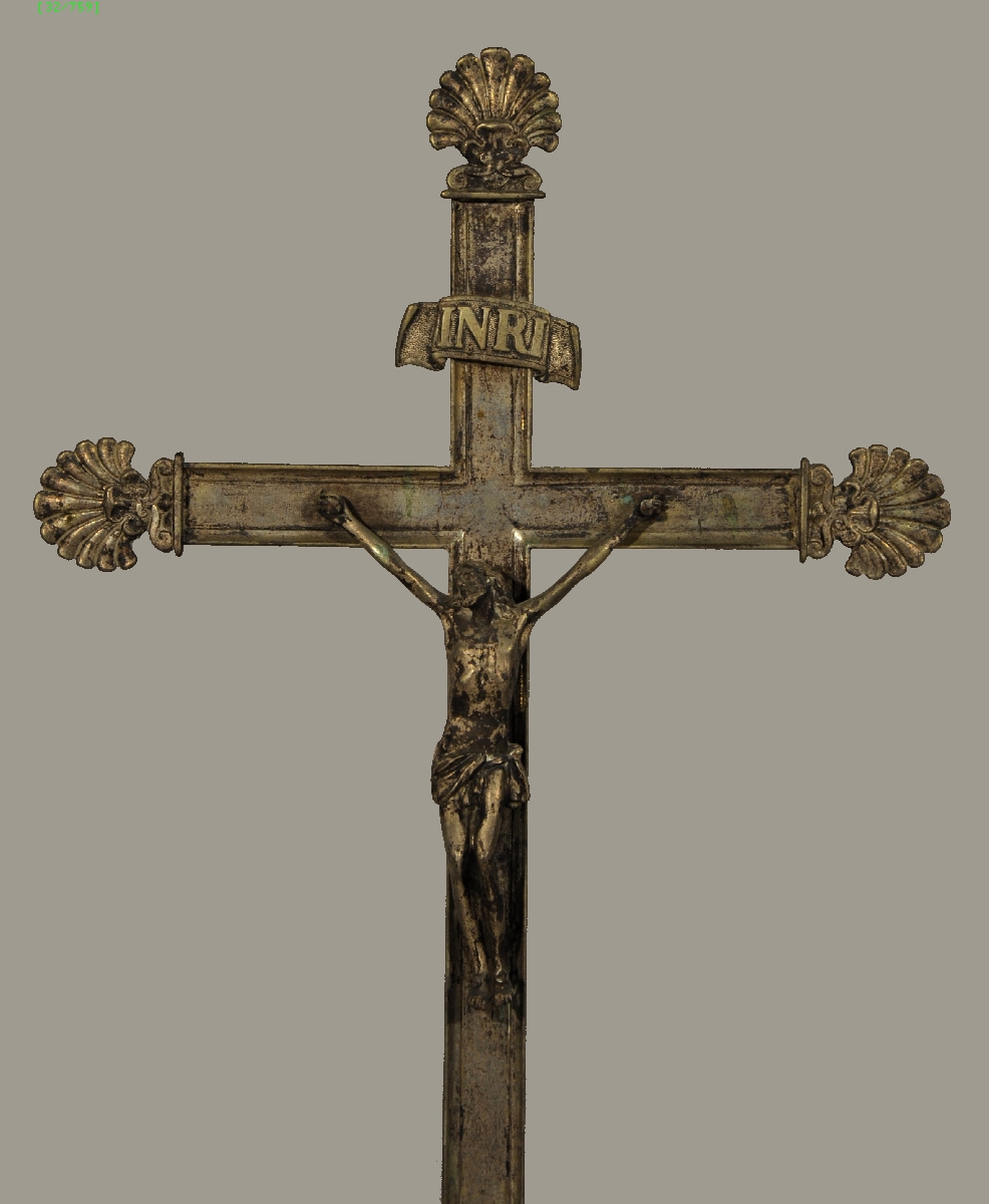 GARNITURE D'AUTEL, comprenant un crucifix et quatre pique-cierges, en métal argenté. Piétements tripodes, ornés sur chacune de leurs faces du Christ, de la Vierge, et de leurs curs ardents. Pieds en forme de pattes de lions. Fûts des piques-cierges cannelés. Extrémités du crucifix ornées de palmes.