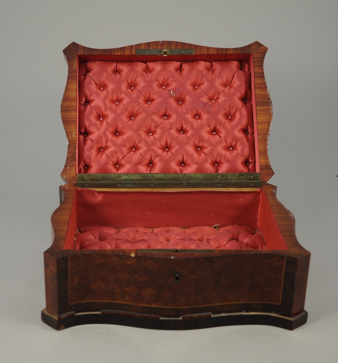BOÎTE à façade et côtés mouvementés. Décor de marqueterie de cubes en bois de rose, dans des encadrements de bois de violette, soulignés d'un filet de bois clair. Intérieur capitonné de soie rose.