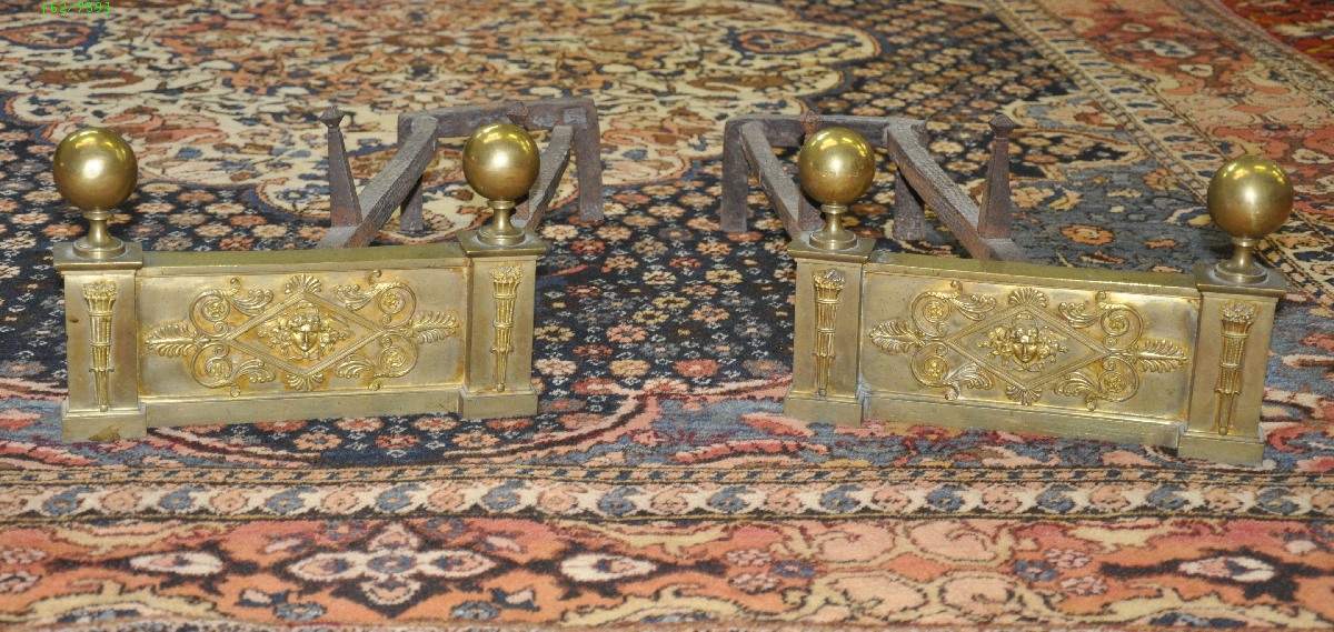 Paire de CHENETS en bronze ciselé. Décorés au centre d'un masque de Méduse dans un losange, entouré de palmettes. Montants ornés de torches et surmontés de sphères.