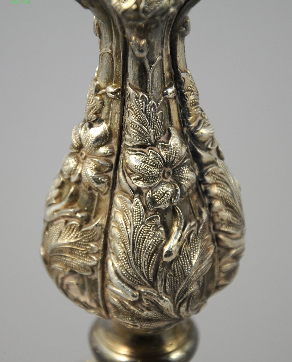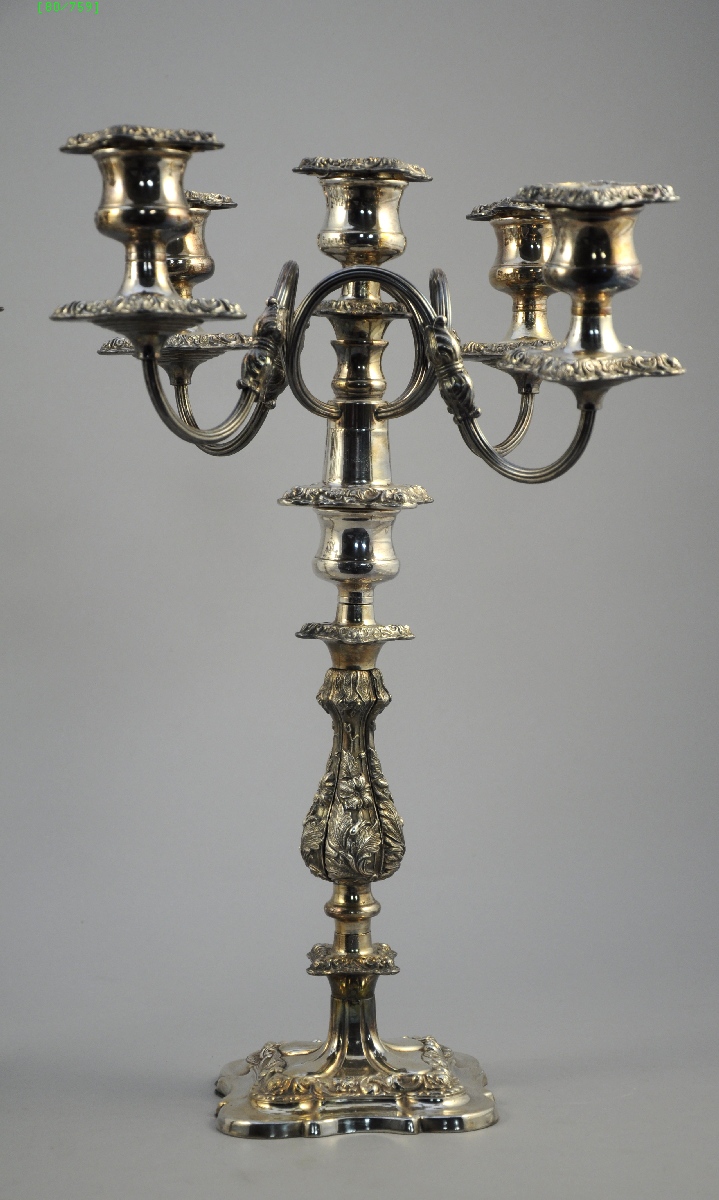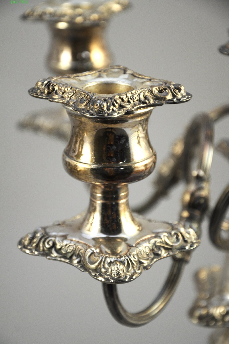 PAIRE de CANDÉLABRES à cinq lumières en métal argenté. Décor floral.
