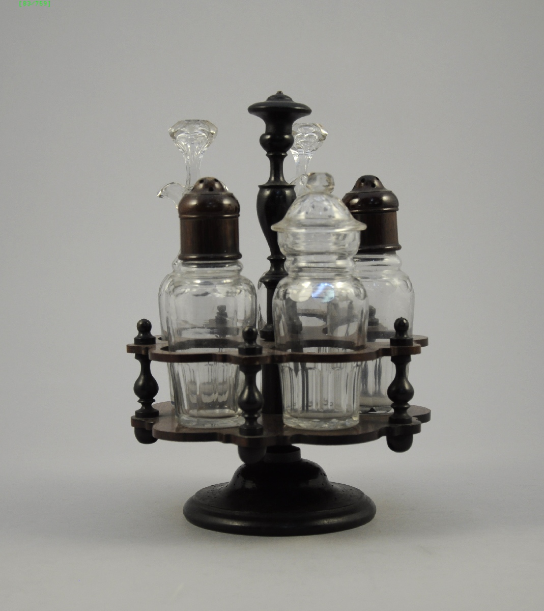 SERVICE de TABLE à double plateau tournant en palissandre avec axe centrale de prise. Il comprend 1 moutardier, 1 huilier, 1 vinaigrier, 1 salière et 1 poivrière en verre taillé.