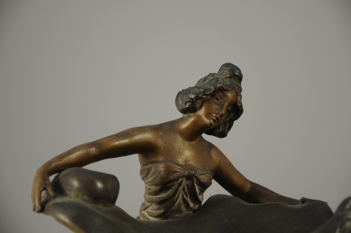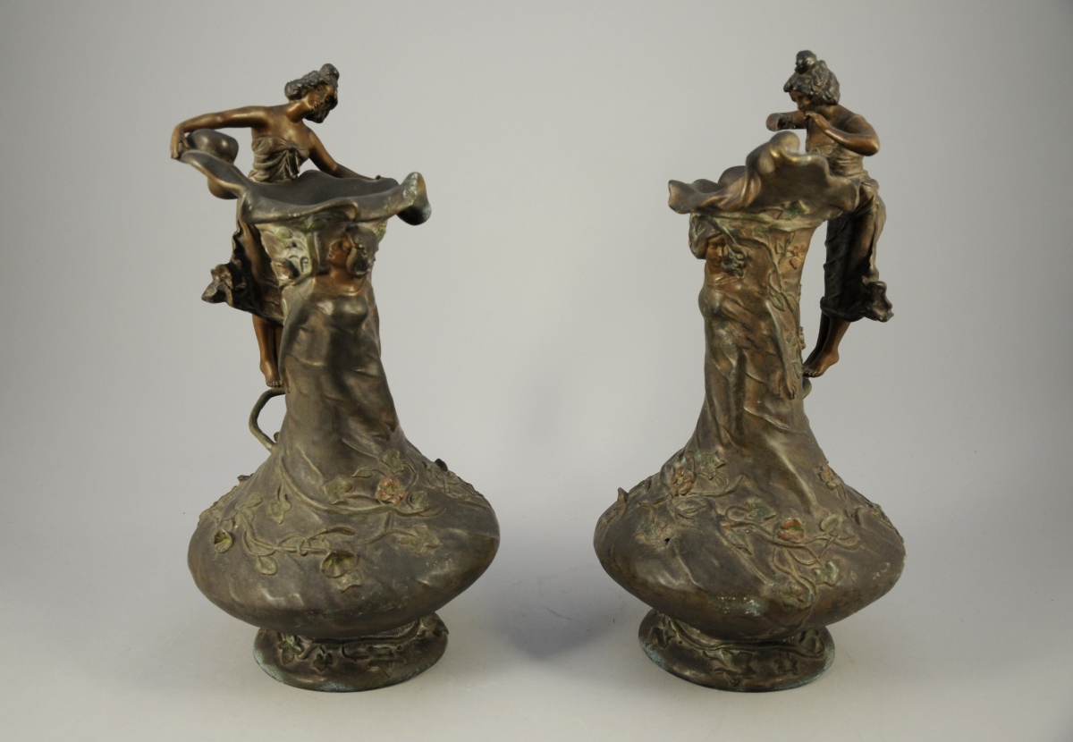 GRISARD (XIXe - XXe). Paire de VASES en forme d'aiguières en régule, à patine brune, verte et rouge. Cols ornés de jeunes filles émergeant de tiges fleuries. Anses figurant des femmes en robe à plissés tourbillonnants, semblant regarder l'eau à l'intérieur des vases. Signés Grisard sous les anses.