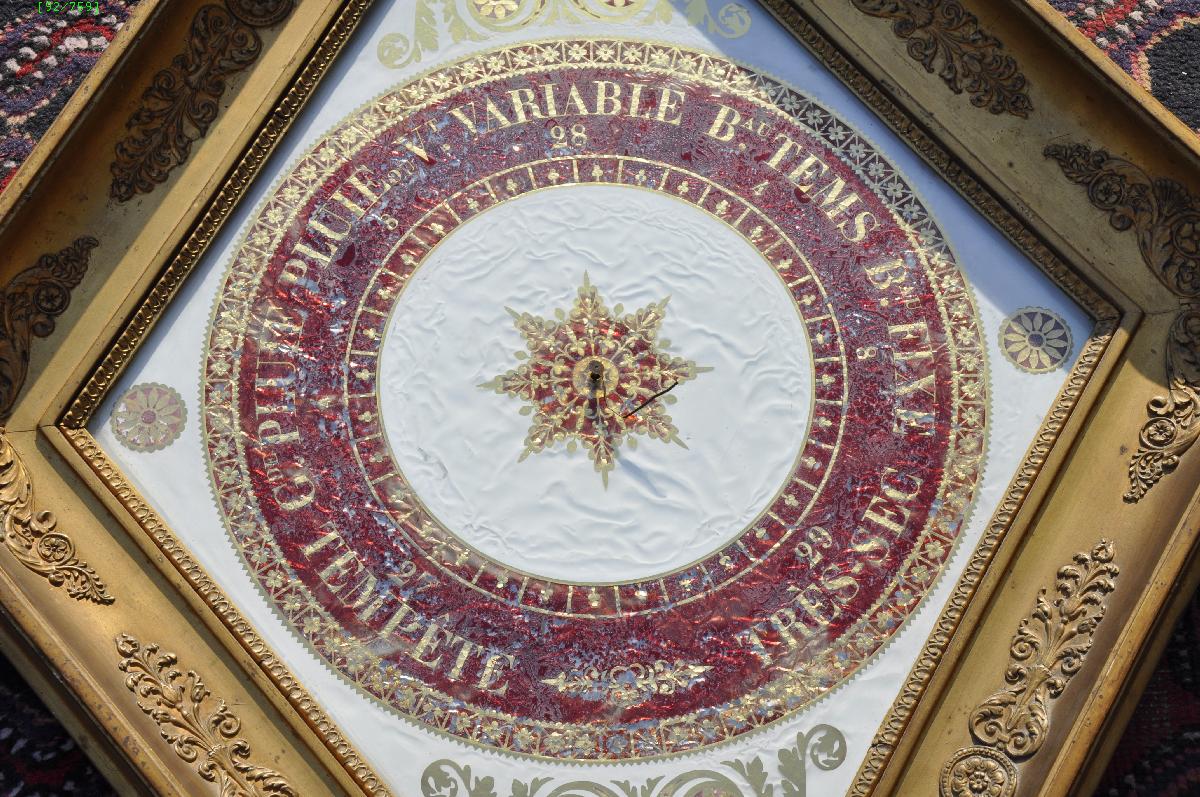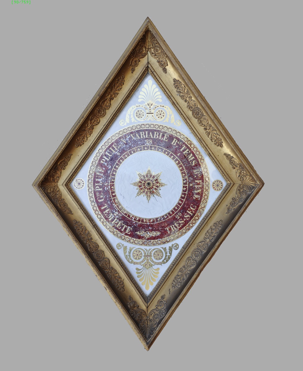 BAROMÈTRE de forme losangique. Cadran en verre églomisé à décor rouge et or sur fond blanc. Cadre en bois stuqué et doré orné de palmes et de rosaces.