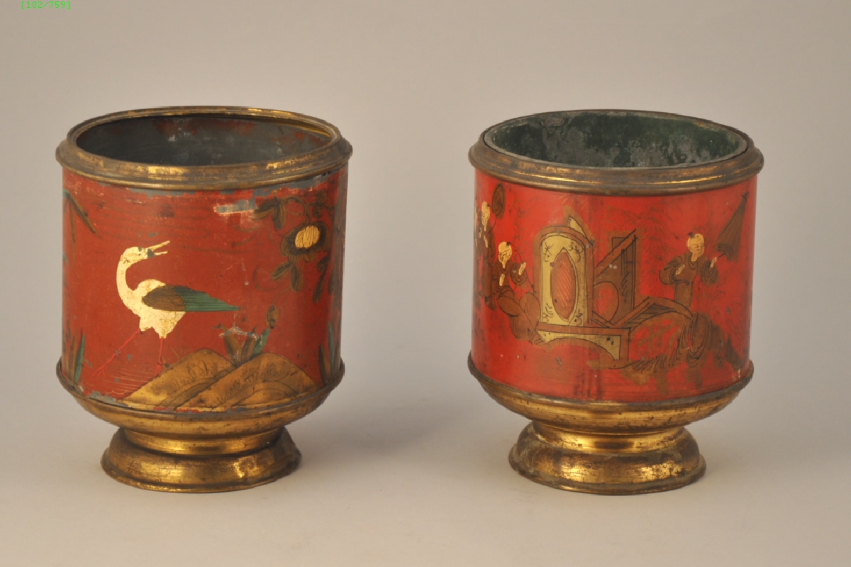 PAIRE DE CACHE POTS en tôle peinte dans le goût chinoisant à décor de pagodes, petits personnages, oiseaux et bambous or sur fond rouge. Bac en tôle de zinc.