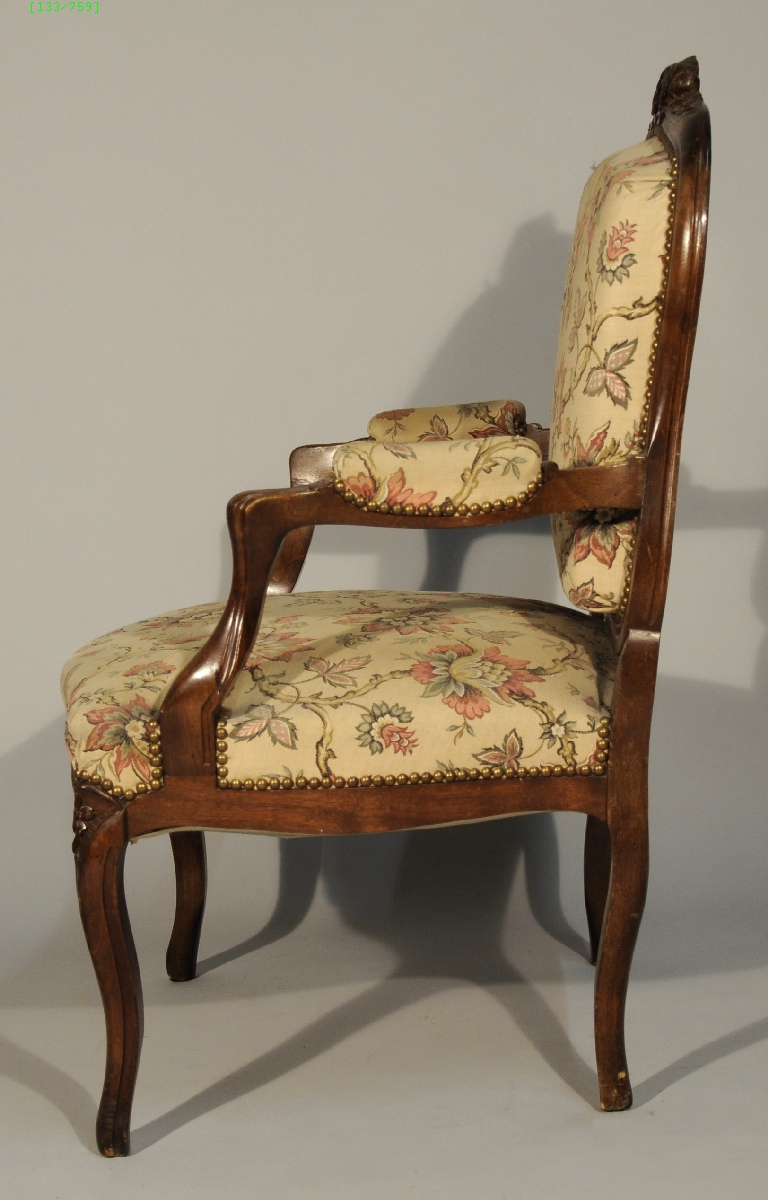 FAUTEUIL à la Reine en bois naturel, le dossier sculpté de feuillages, les accotoirs mouvementés à manchettes et la ceinture sculptée de fleurettes, reposant sur quatre pieds moulurés et cambrés.