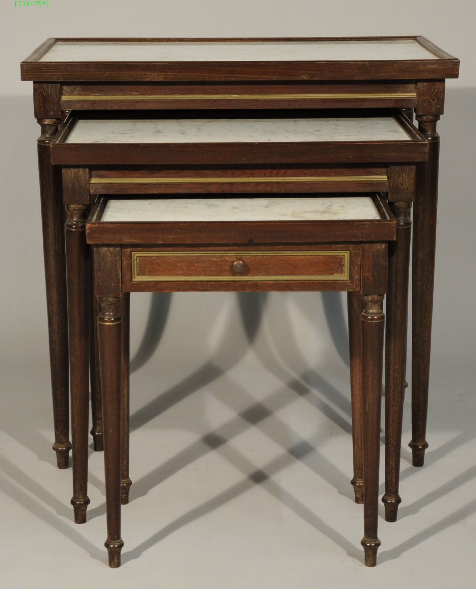 Trois TABLES GIGOGNES en acajou, l'une ouvrant à un tiroir. Dessus marbre.