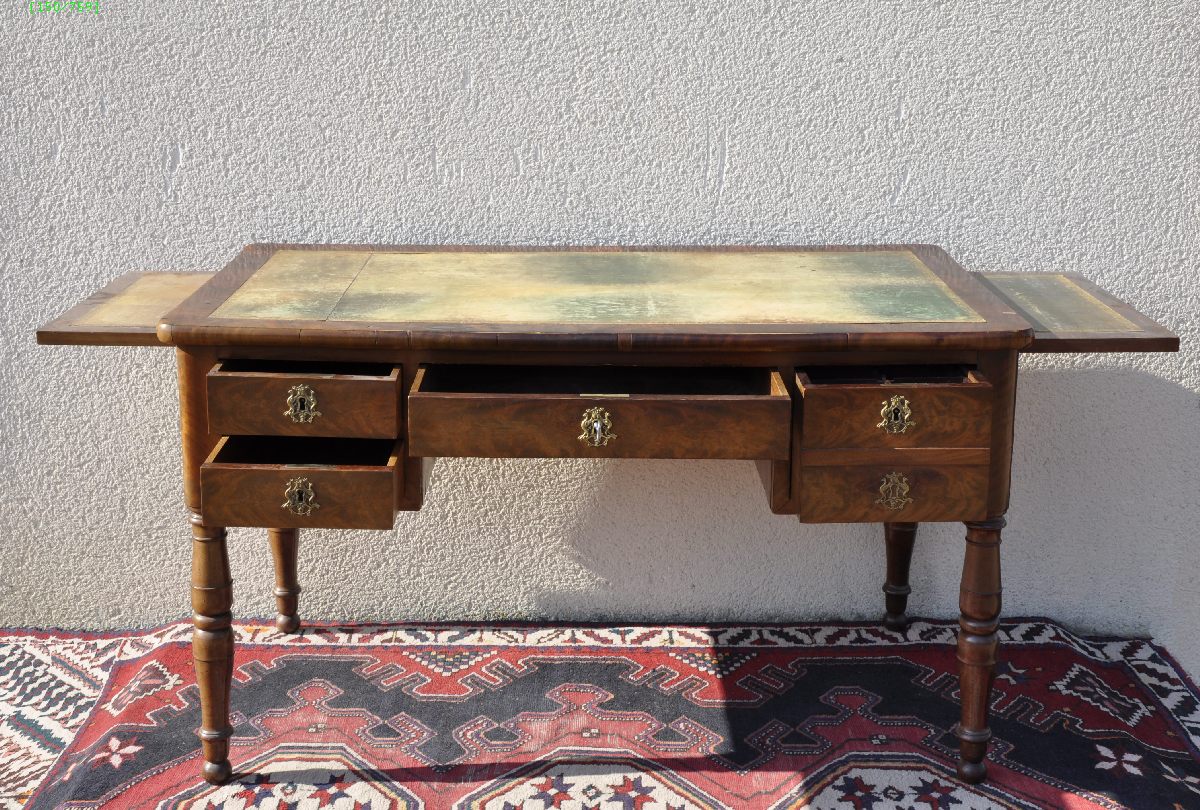 Plateau et tirettes foncés d'un cuir vert à bordures dorées (insolé et usé).
