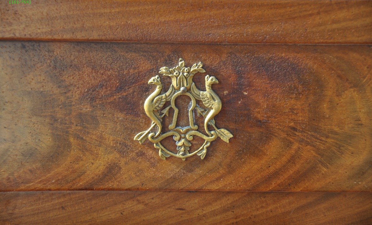 BUREAU plat en acajou et placage d'acajou. Il ouvre par 4 tiroirs, la façade de l'un d'eux simulant deux tiroirs, et par deux tirettes sous le plateau. L'autre côté simule une façade à tiroirs en symétrie. Repose sur des pieds tournés. Entrées de serrures en bronze doré, figurant un vase surmonté d'une palmette avec, de part et d'autre, des cygnes.