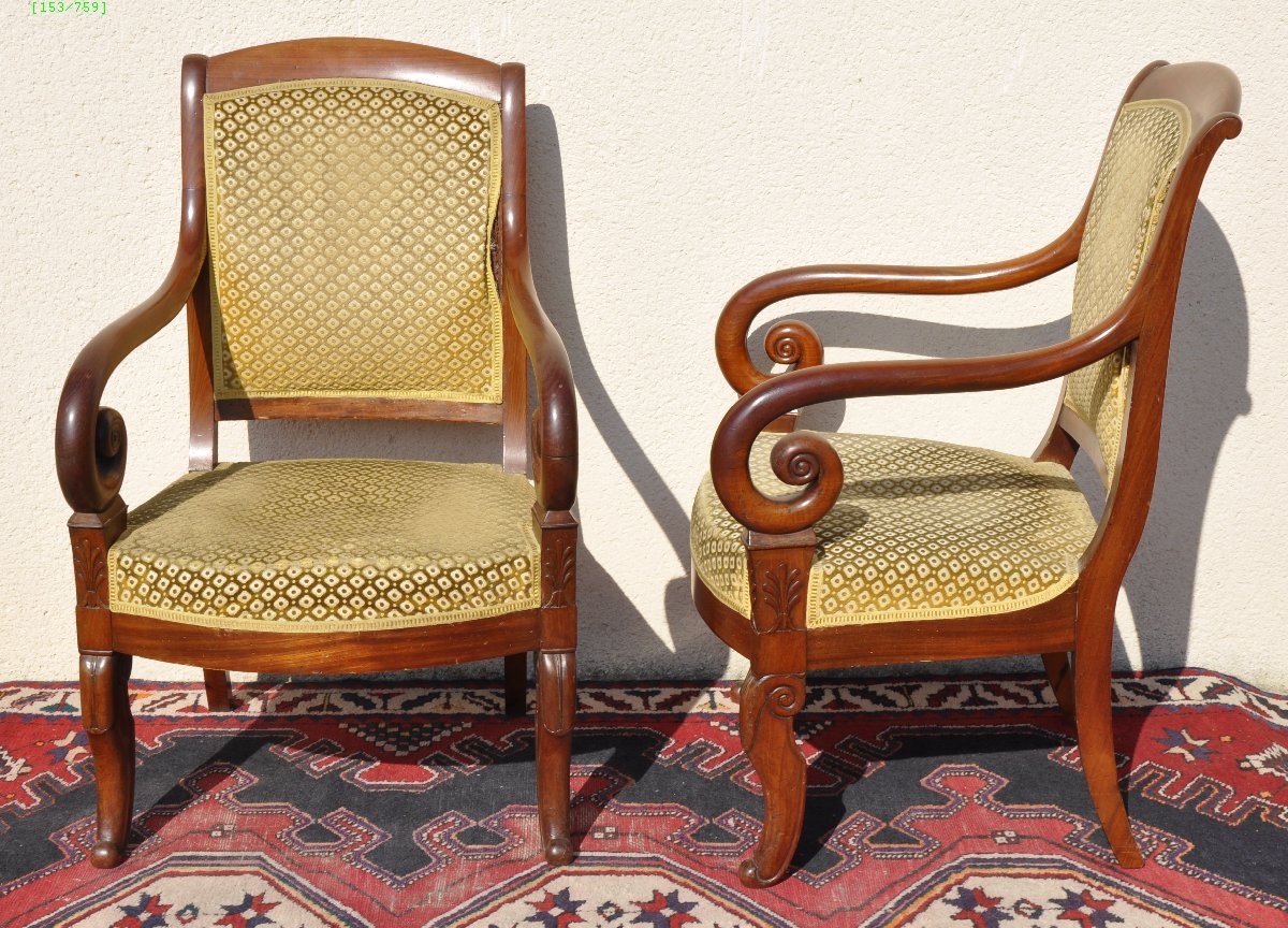 Paire de FAUTEUILS en acajou et placage d'acajou. Dossiers légèrement renversés. Accotoirs à enroulements, reposant sur des consoles sculptées de palmettes. Pieds antérieurs en "cuisses de grenouille", pieds postérieurs en sabres.