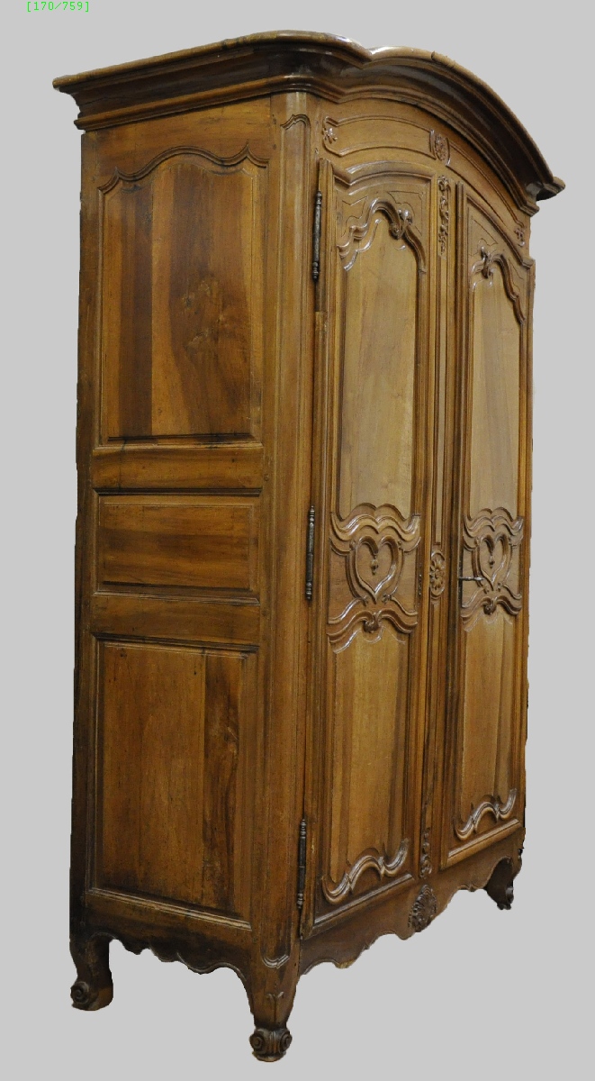 Grande ARMOIRE en noyer mouluré et sculpté. Partie supérieure à chapeau de gendarme. Elle ouvre par deux vantaux à trois panneaux moulurés, celui du centre en forme de cur et orné de fleurettes. Traverse supérieure et faux-dormant à décor de fleurs. Traverse inférieure chantournée et sculptée d'une coquille. Repose sur de petits pieds cambrés en escargot. Côtés panneautés. Garnitures de fer forgé ; belle serrure ouvragée à longs pennes.
