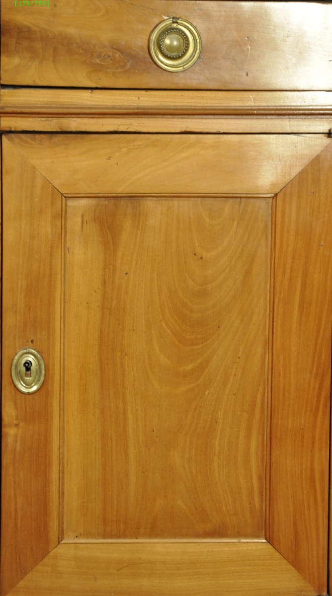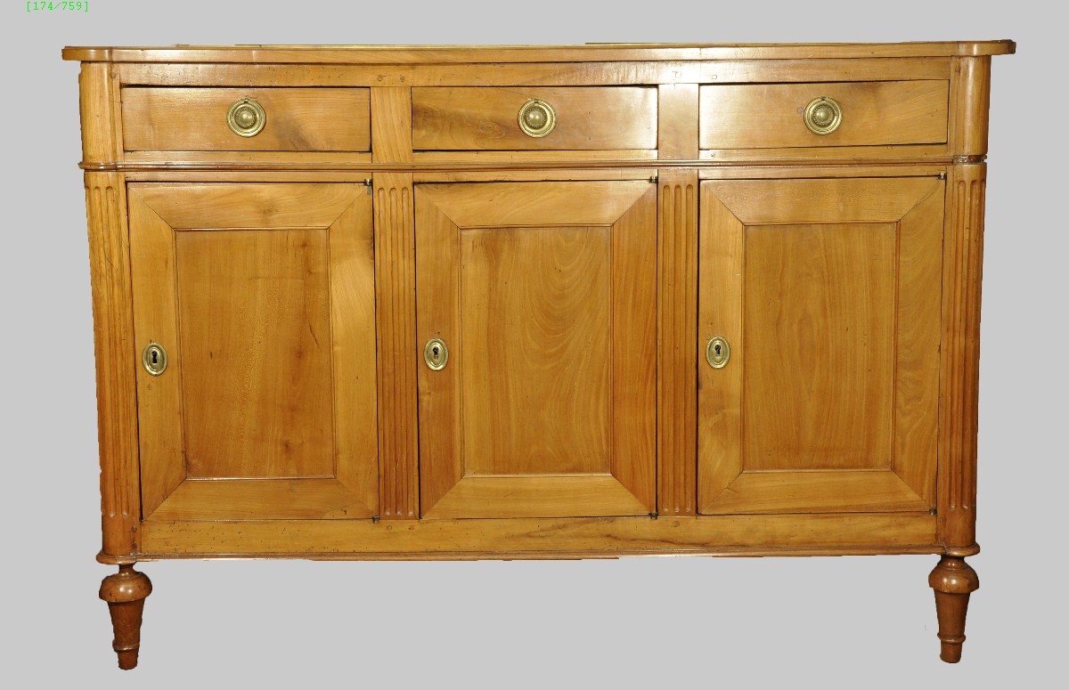 BUFFET en merisier, ouvrant par trois portes et trois tiroirs. Montants cannelés. Pieds toupies. Garnitures de laiton, telles que poignées mobiles et entrées de serrures.