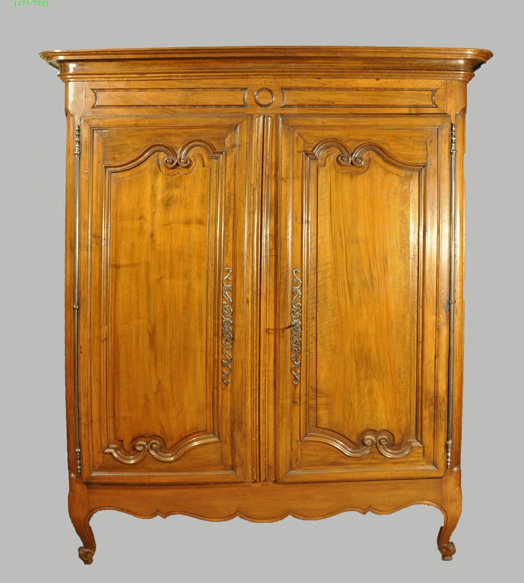 Petite ARMOIRE en noyer mouluré. Portes à motifs de volutes. Traverse inférieure chantournée. Pieds cambrés en escargots. Belles garnitures de fer forgé.