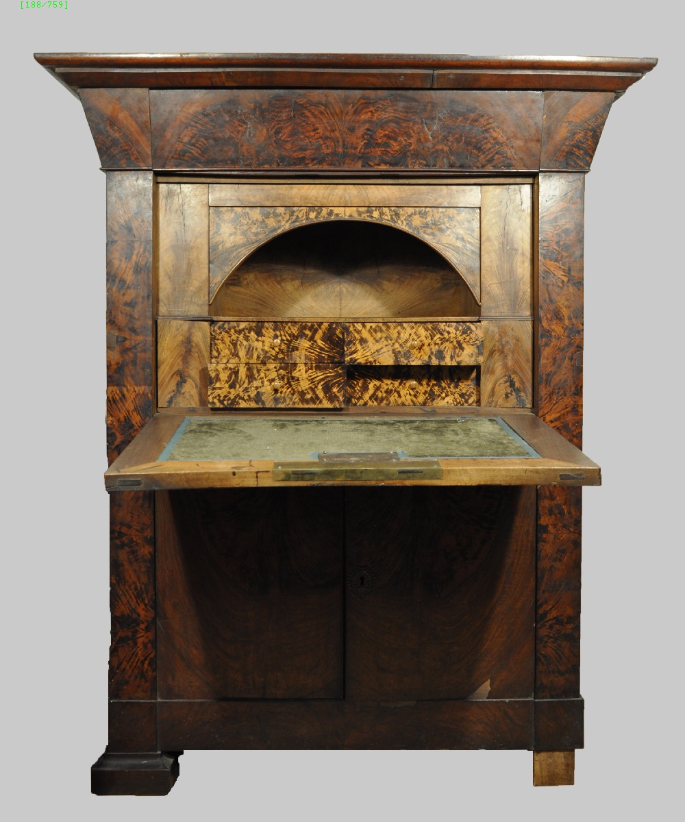 SECRÉTAIRE à abattant en placage d'acajou rayonné. Il ouvre par un grand tiroir en partie supérieure. L'abattant, foncé d'un velours vert, découvre un intérieur en placage de bois clair, garni de quatre tiroirs, surmontés d'un casier en demi-lune, et de deux tiroirs dissimulés, ouvrant par un mécanisme à ressort. Deux portes en partie inférieure. Entrées de serrure en bronze, à décor de guirlandes de feuilles et de fleurs.