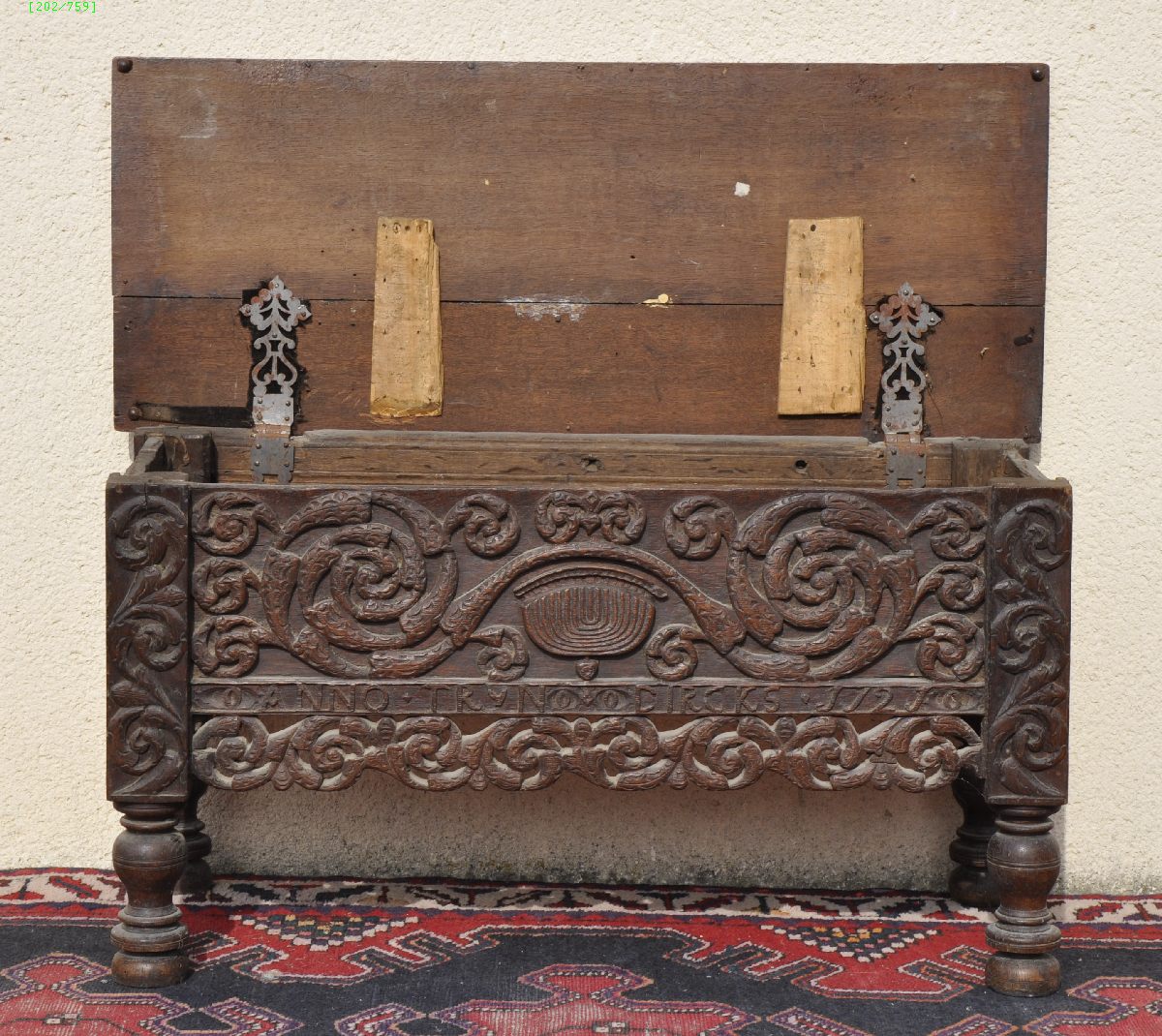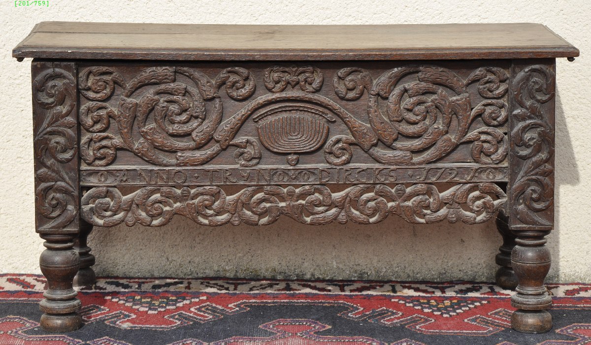 BANC-COFFRE en chêne sculpté de volutes et de feuillages stylisés, avec une inscription gravée en partie inférieure : "Anno Trin Dircks 1721". Pieds tournés.