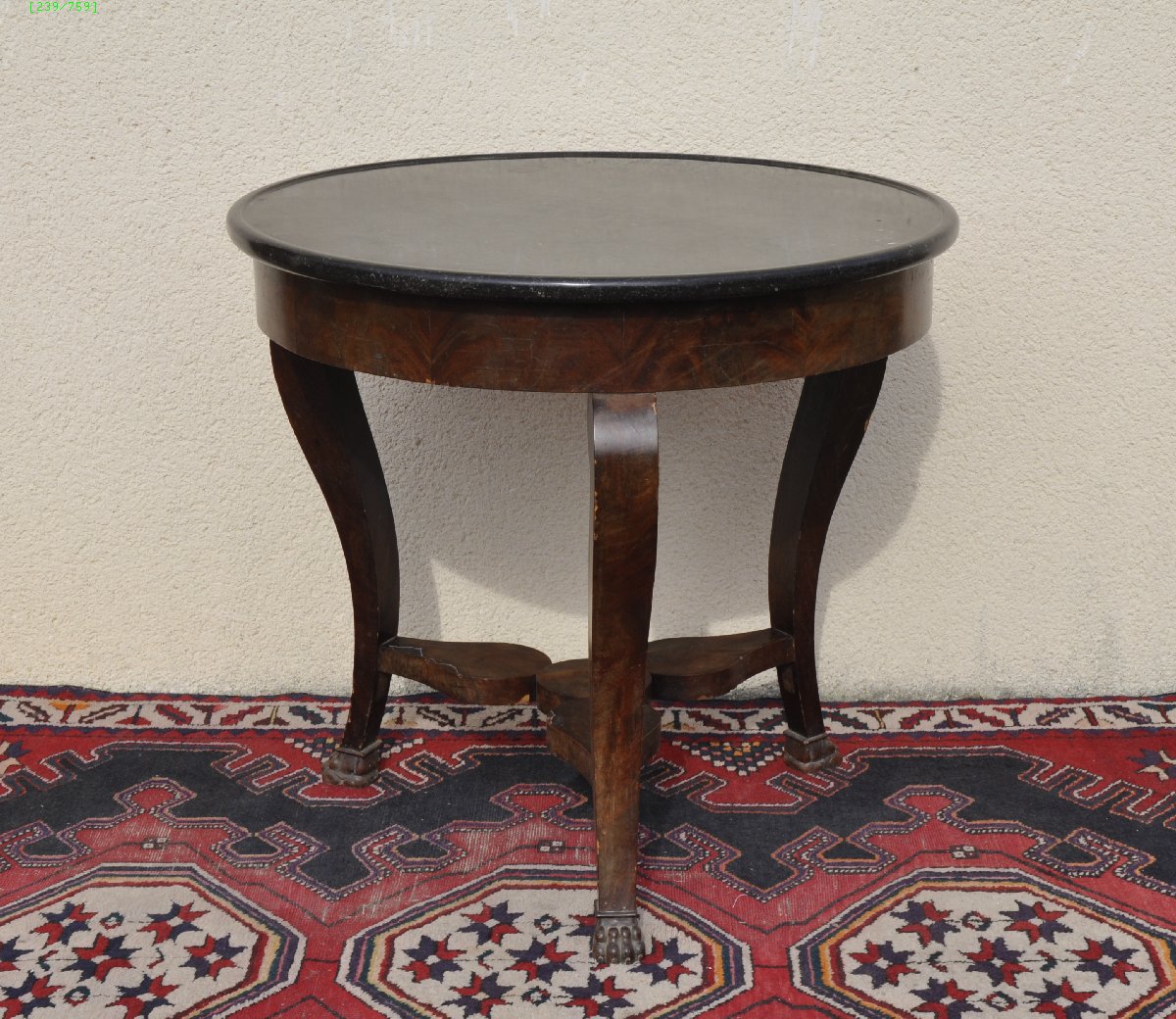 GUÉRIDON tripode en acajou. Pieds terminés par des pattes de lions et réunis par une entretoise. Dessus de marbre gris à rebord.