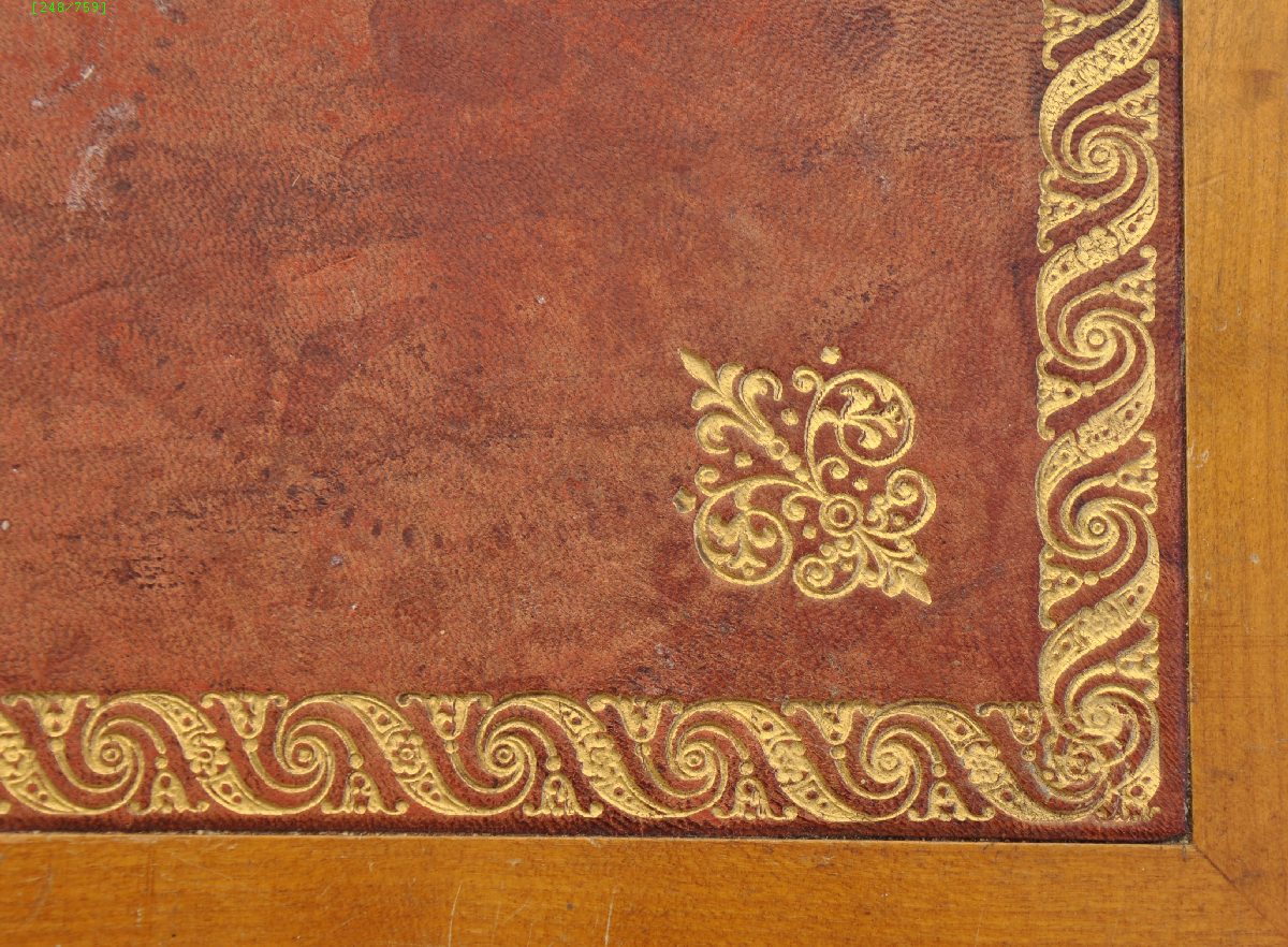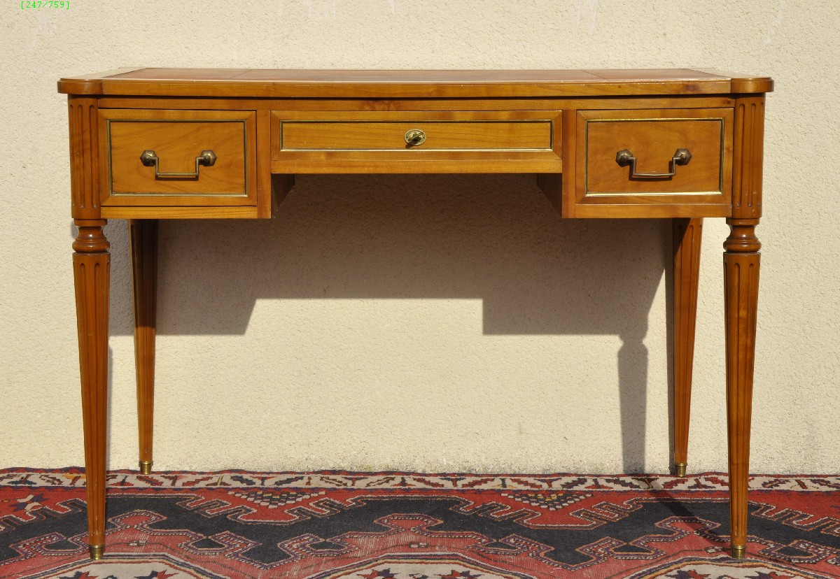 BUREAU plat en hêtre teinté, ouvrant par trois tiroirs en ceinture. Pieds fuselés cannelés. Garnitures de métal doré : poignées mobiles, baguettes d'ornementation au niveau des tiroirs et sabots de pieds.