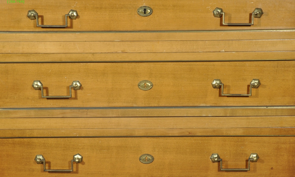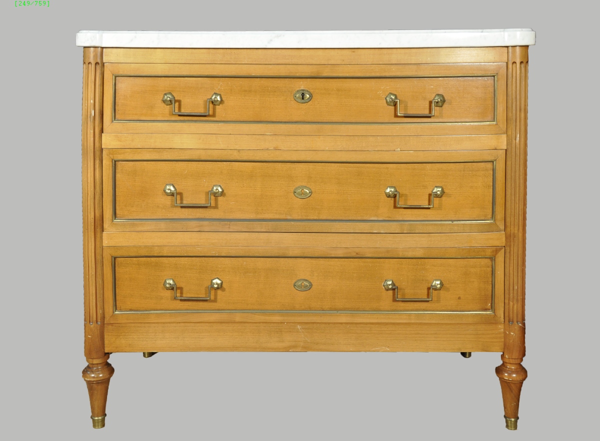 COMMODE en hêtre teinté, ouvrant par trois tiroirs. Pieds toupies, montants cannelés. Dessus de marbre blanc veiné gris.
