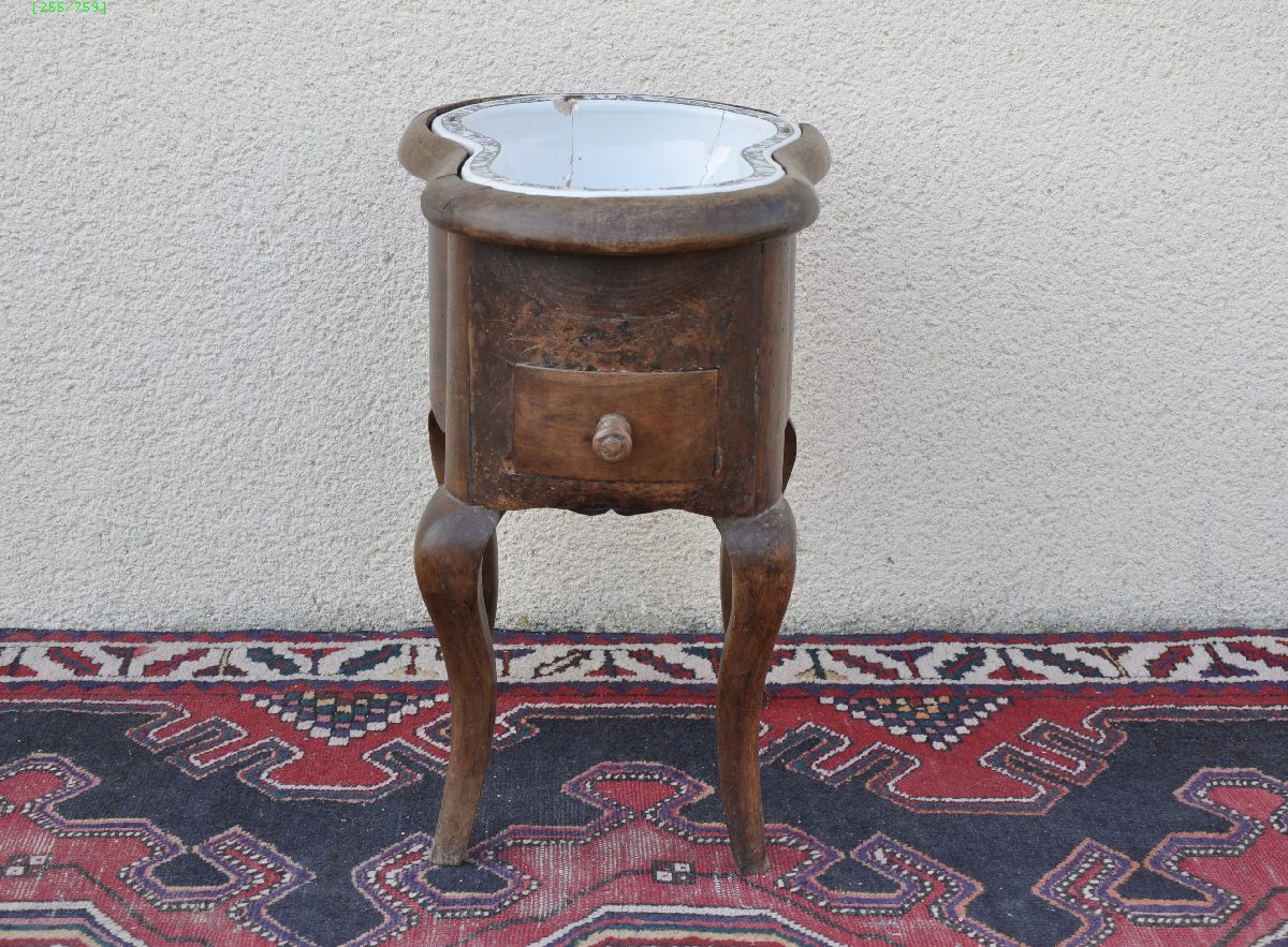 BIDET en bois naturel, à piétement cambré, ceinture chantournée, et ouvrant par un tiroir. Cuvette en faïence à décor d'une corne fleurie en bleu et manganèse de grand feu.