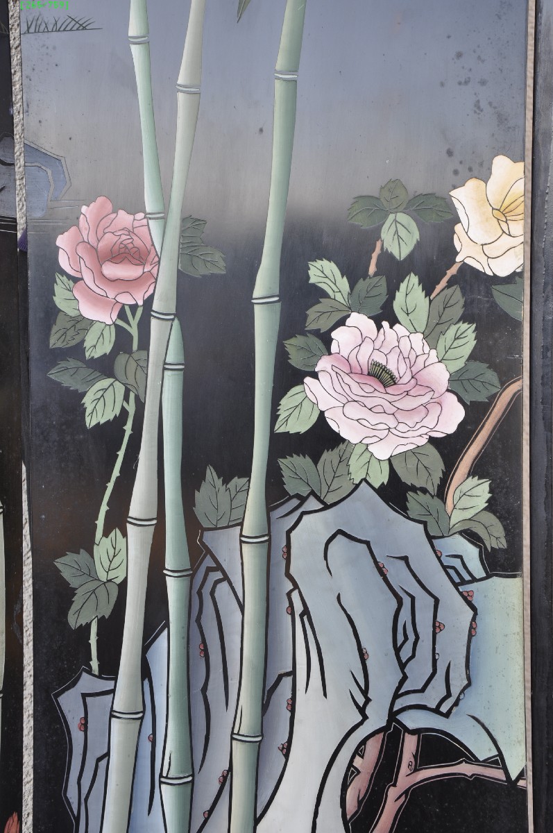 PARAVENT à quatre feuilles en laque à décor polychrome sur fond noir d'oiseaux dans un paysage lacustre. Au revers, décor gravé en creux de végétaux. Petits pieds protégés par des plaques de laiton.