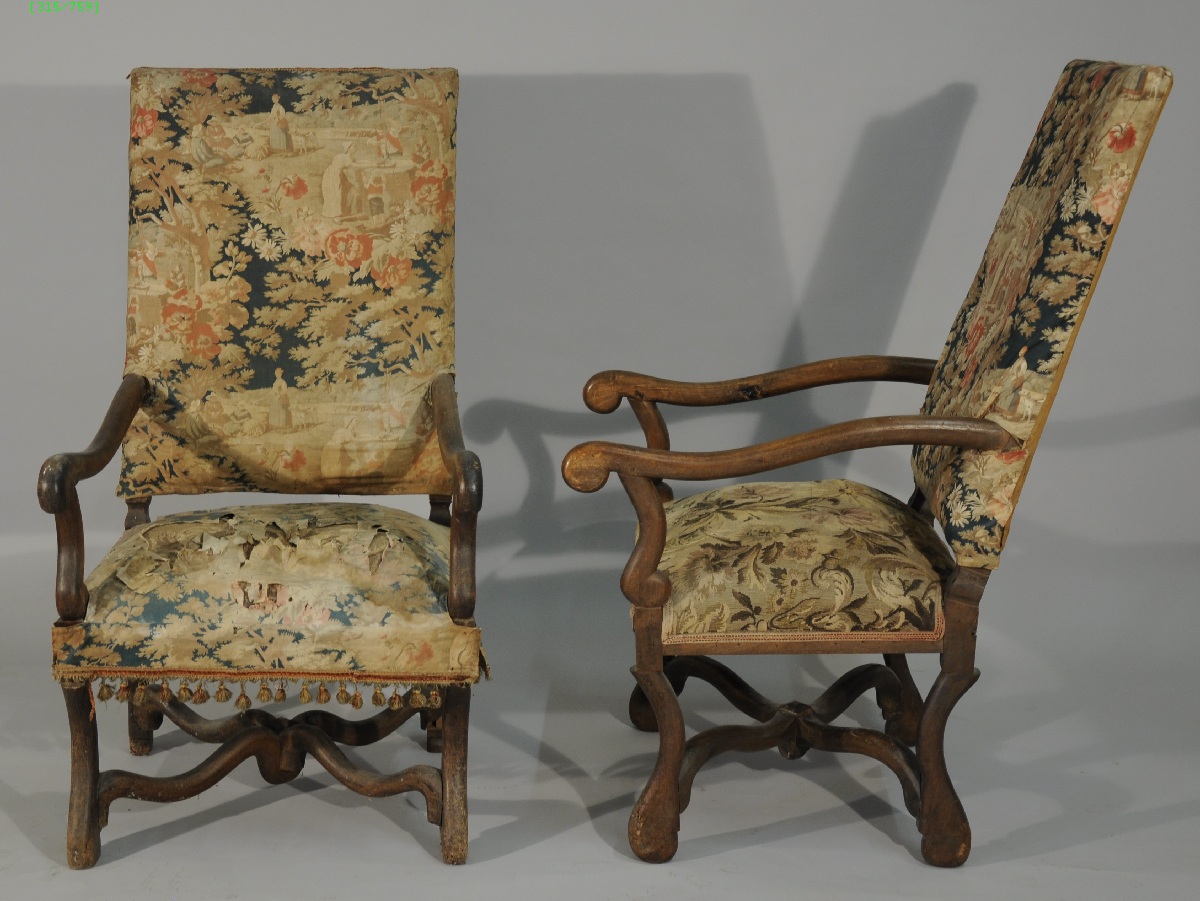 Haut. 115, Larg. 60 et 62, Prof. 77 et 72. (trous de vers, usure prononcée à deux pieds de l'un des fauteuils)