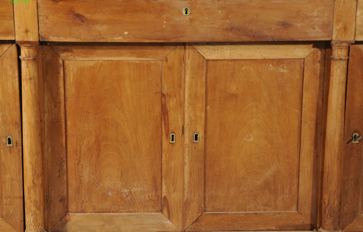 BUFFET en merisier. Il ouvre par quatre portes et trois tiroirs en ceinture. Façade à quatre colonnes détachées, reposant sur des pieds carrés.