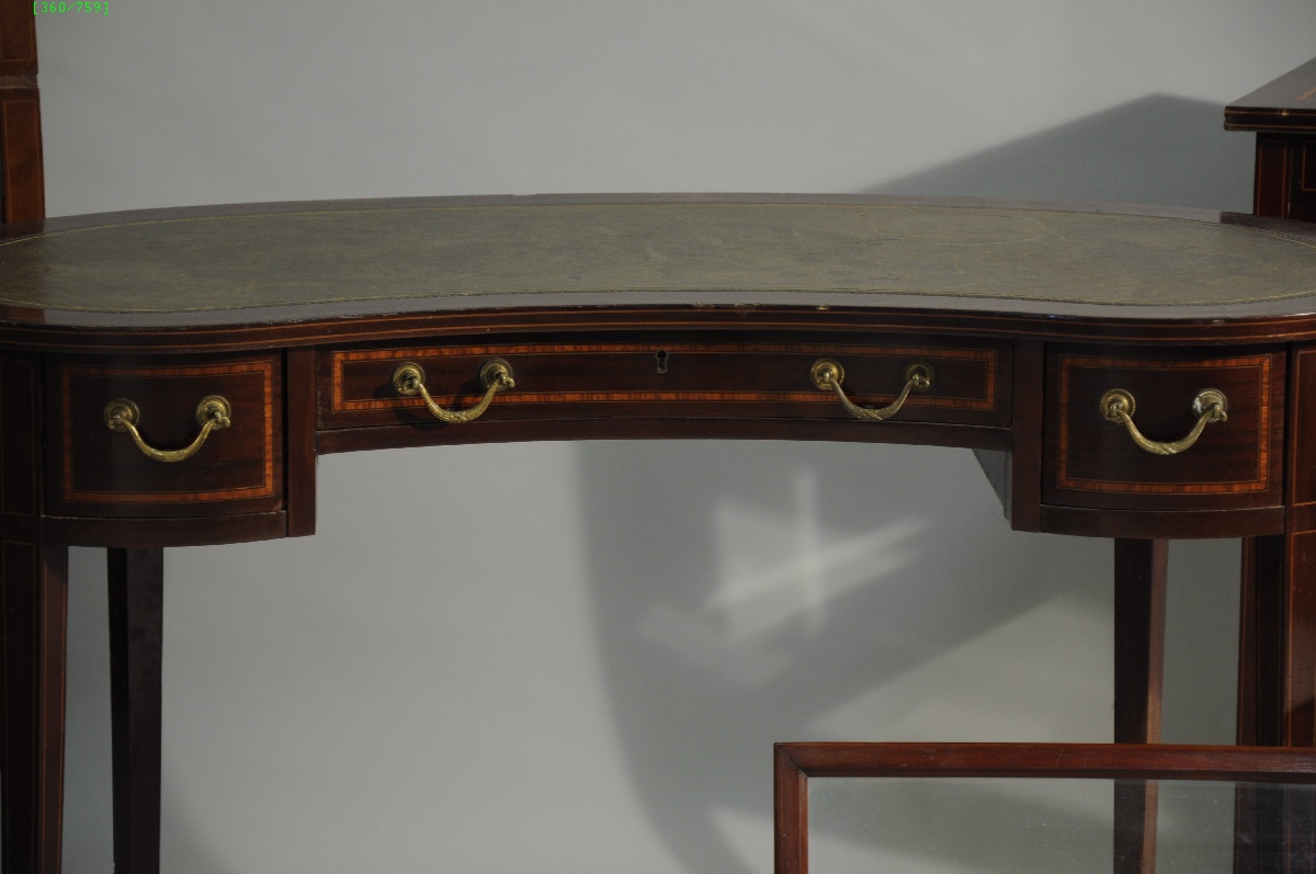 -une TABLE-BUREAU de forme rognon, à dessus de cuir vert et ouvrant par trois tiroirs en ceinture. Pieds carrés fuselés. Haut. 72, Larg. 105, Prof. 46 cm.