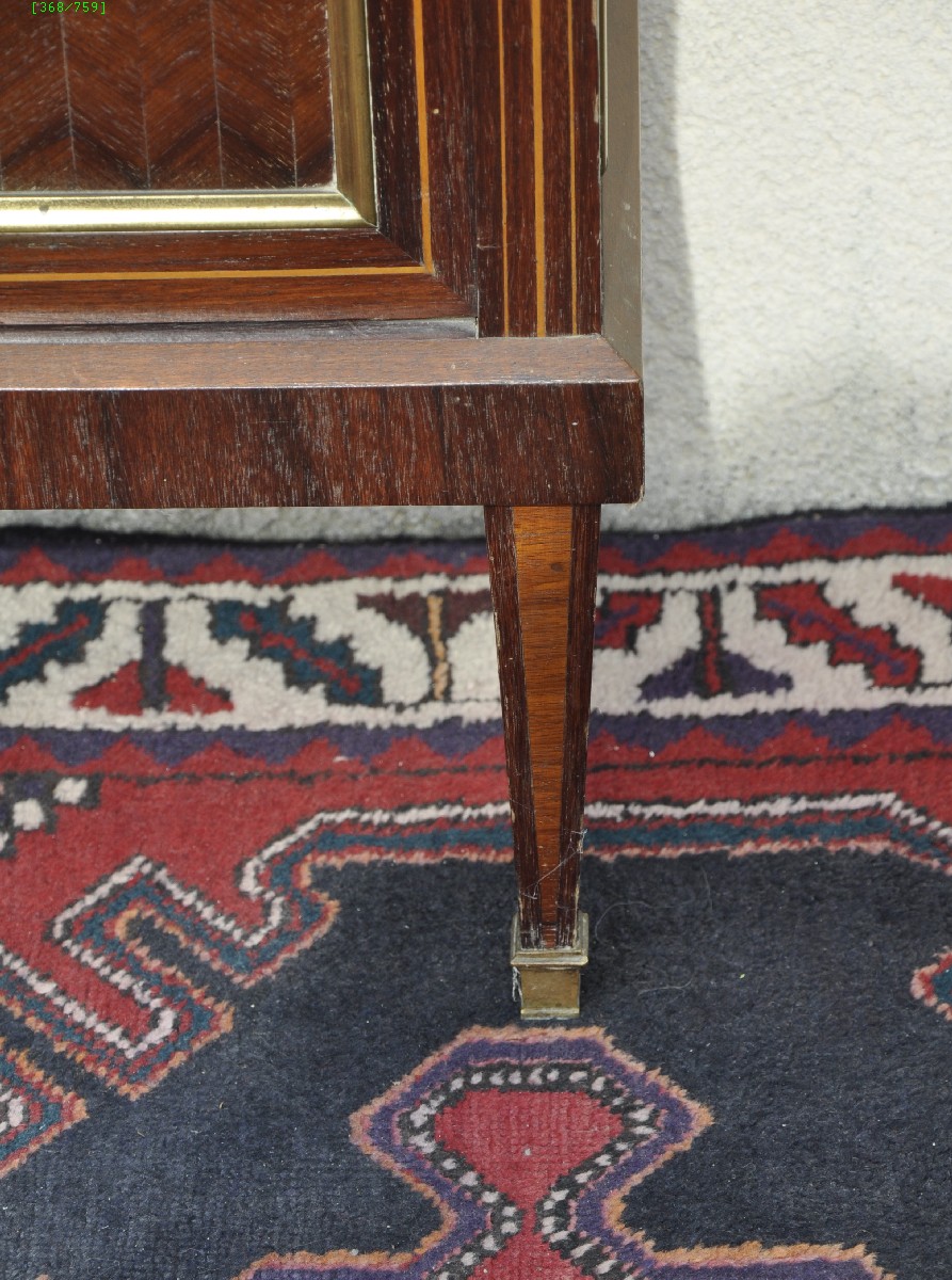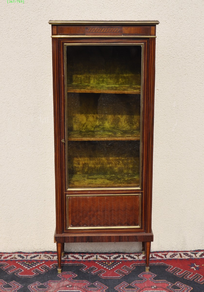 VITRINE à décor marqueté d'entrelacs et filets de bois clair sur fond de placage d'acajou et bois de rose en frise. Porte et côtés vitrées, avec baguettes de métal doré. Pieds carrés fuselés, à sabots de bronze. Dessus de marbre rouge veiné blanc. Intérieur garni de trois étagères recouvertes de velours vert.