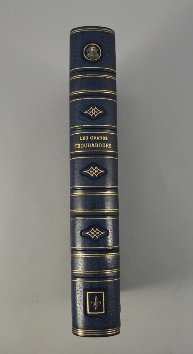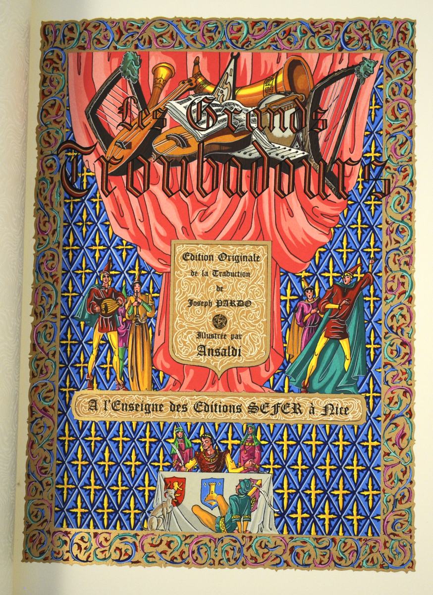 Les Grands Troubadours. Ed. d'art Sefer, 1981. In-folio pl rel décorée, ornée pour un plat sup. d'un troubadour en relief et de fleurs de lys angulaires. Encadrements et il in et HT en coul de ANSALDI. Ex. num, signé de l'éditeur et de l'artiste. Avec une estampe en coul signée. Bel ouvrage en bel état.