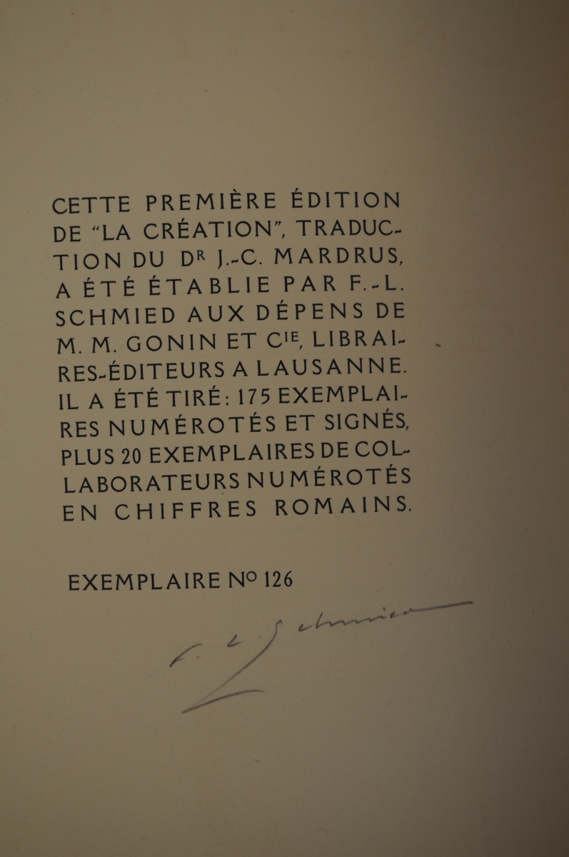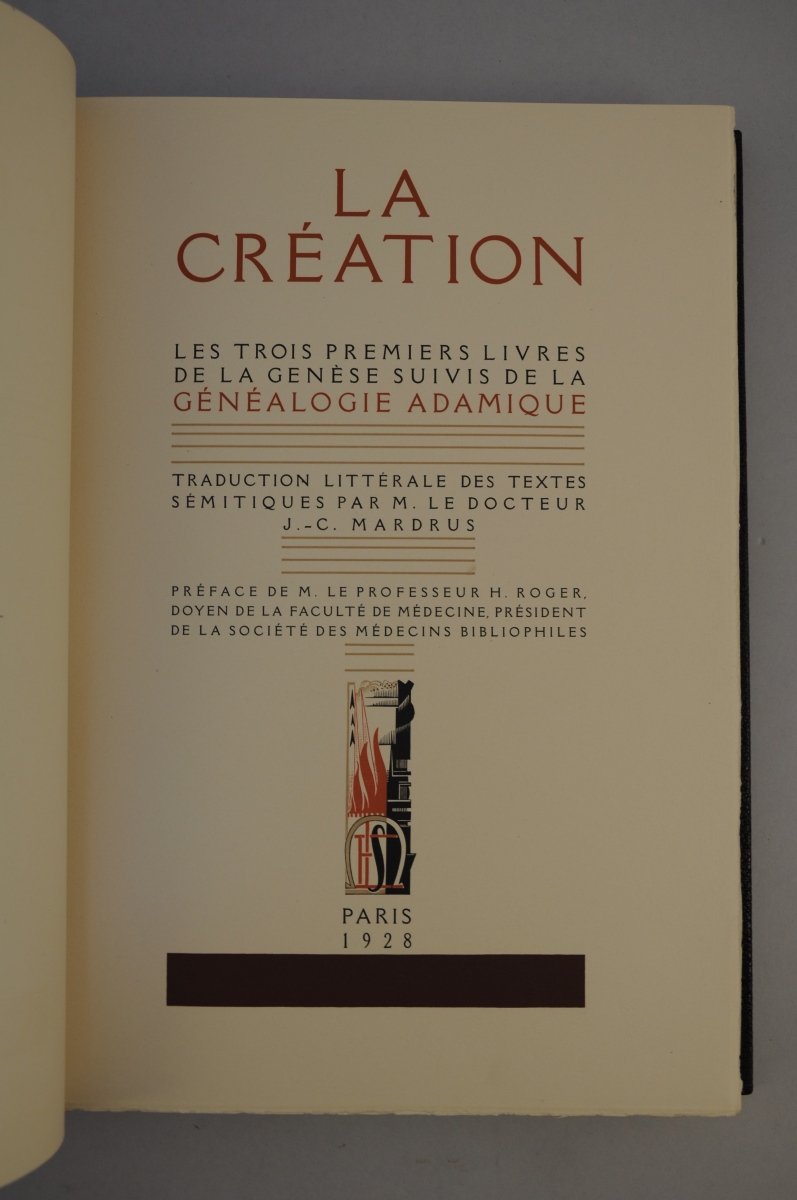 MARDRUS. La Création. Les trois premiers livres de la génèse suivis de la généalogie adamique. Paris, 1928.