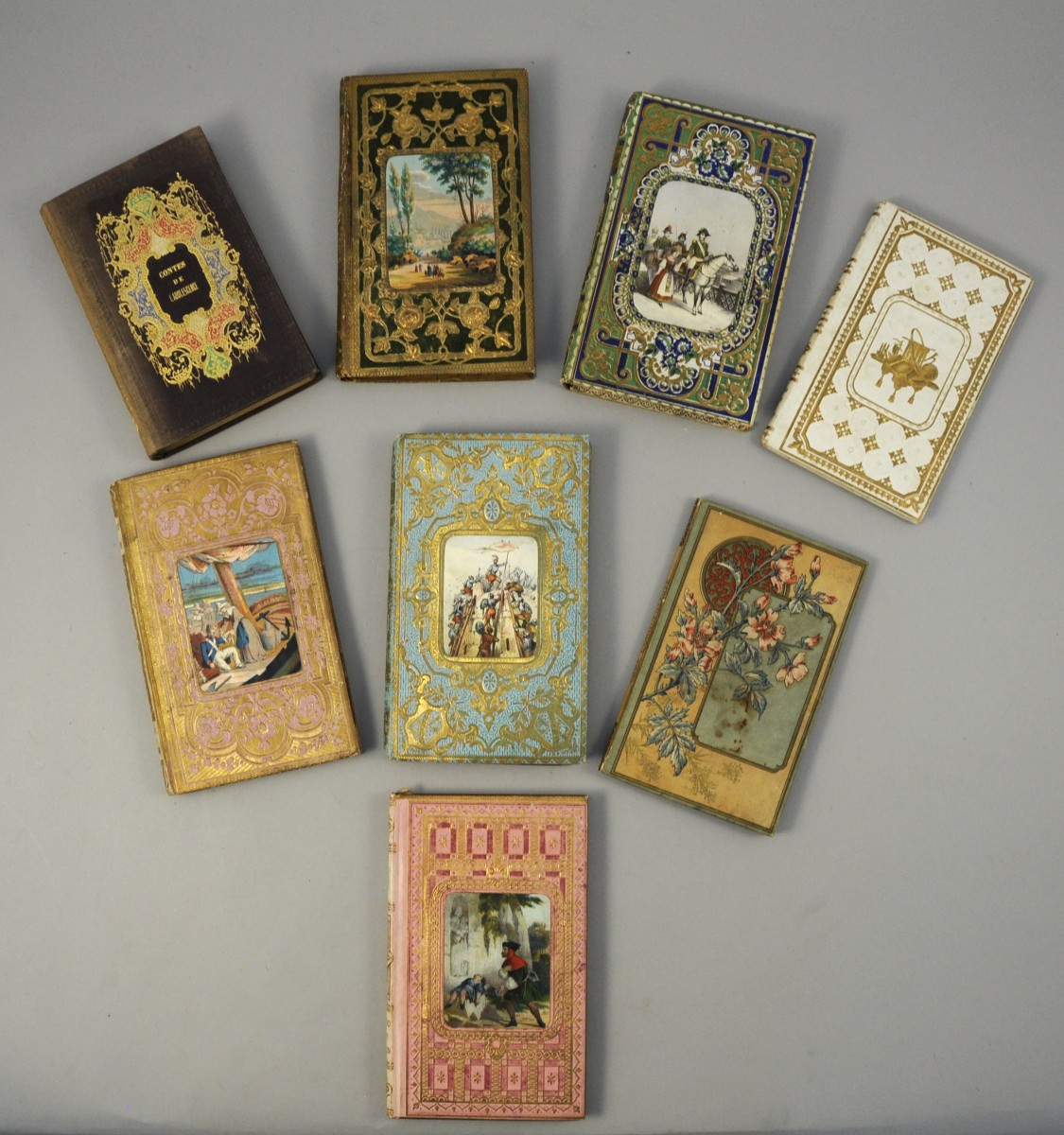 Cartonnages gaufrés ép. 19ème, la plupart en bel état. Env 50 vol.