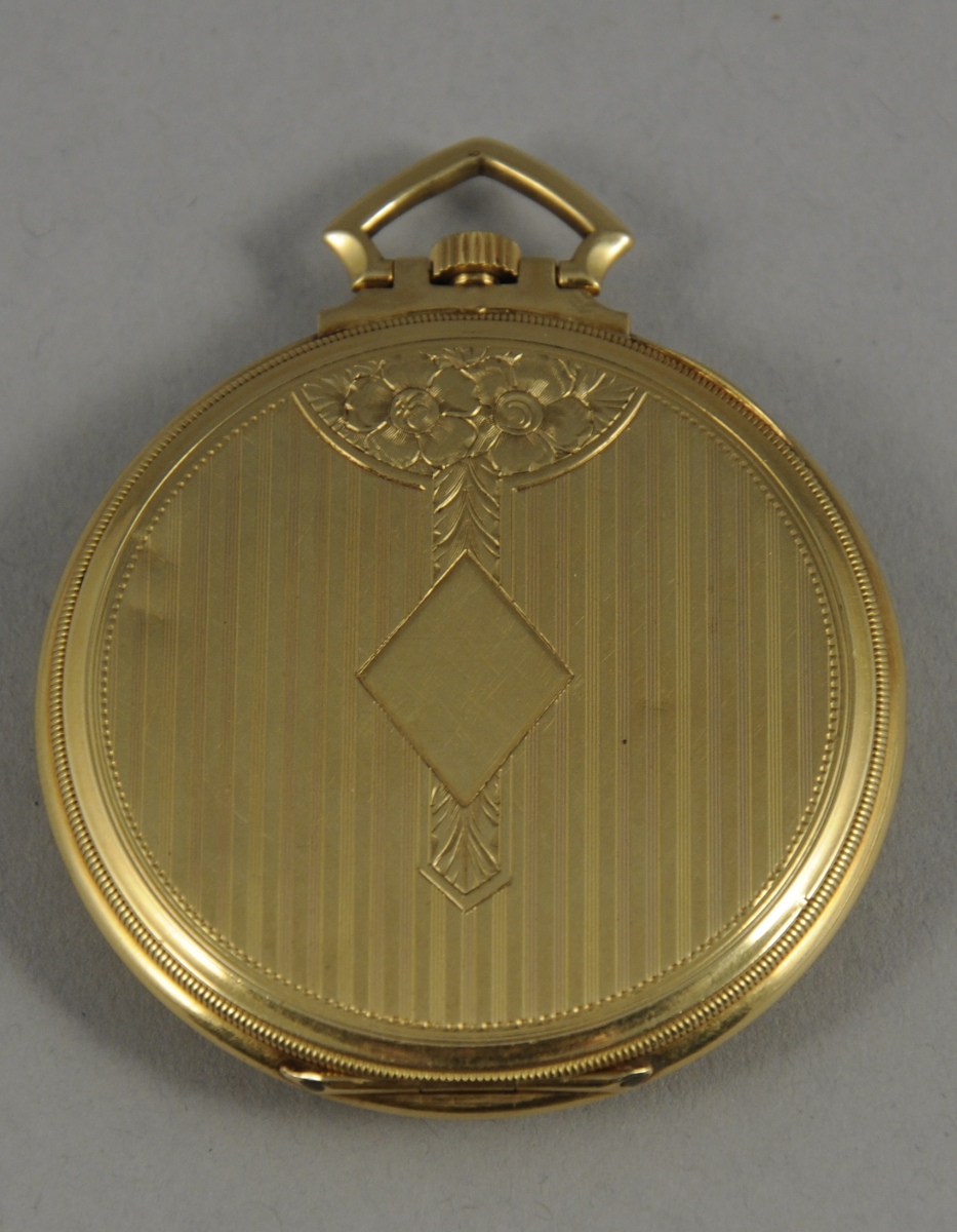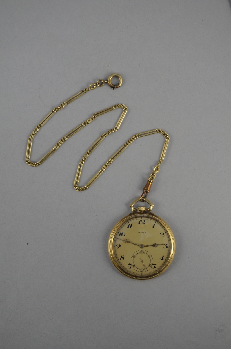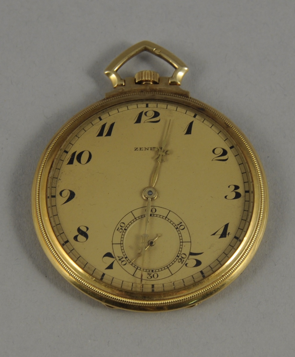 MONTRE GOUSSET à remontoir, en or. Double cadran avec aiguilles aux fleurs de lys. Revers guilloché et orné de fleurs. Cadran signé ZENITH.