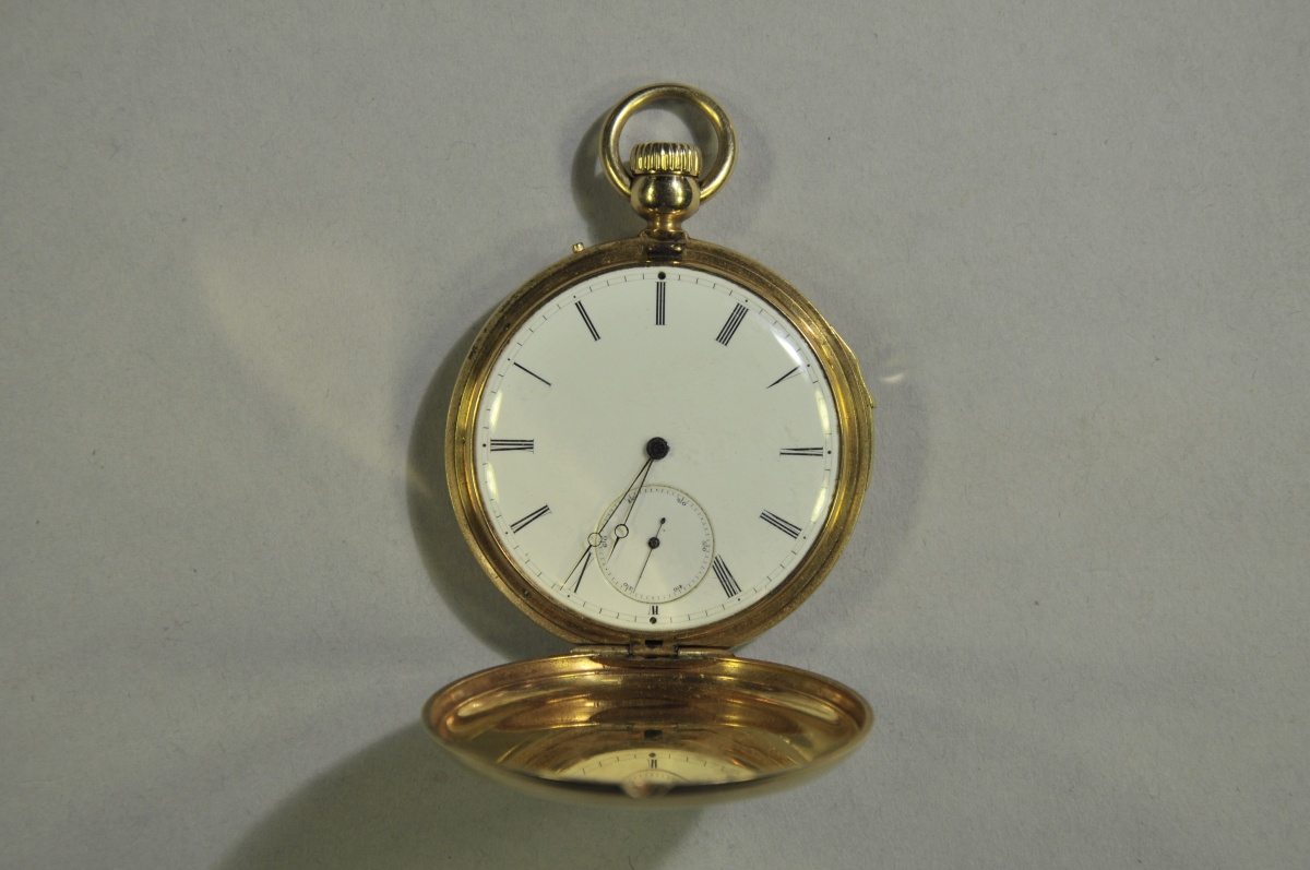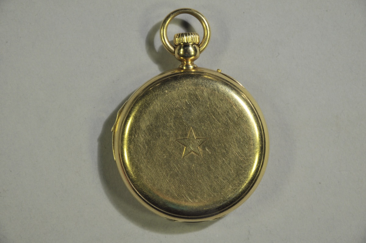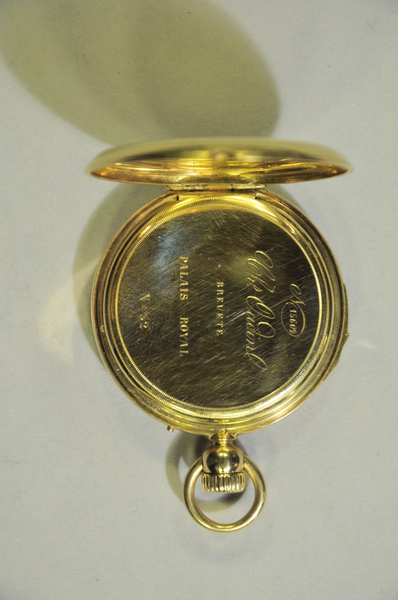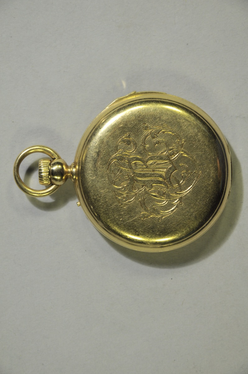 MONTRE SAVONNETTE en or jaune à remontoir au pendant. Le boîtier est orné sur l'avant d'un monogramme et sur l'arrière d'une étoile sur fond guilloché. Le cadran, en émail blanc, indique les heures en chiffres romains. Cadran secondaire à neuf heures pour les secondes. La cuvette porte les inscriptions "N15602" et "Chs Oudin Breveté Palais Royal n° 52". Poinçon.