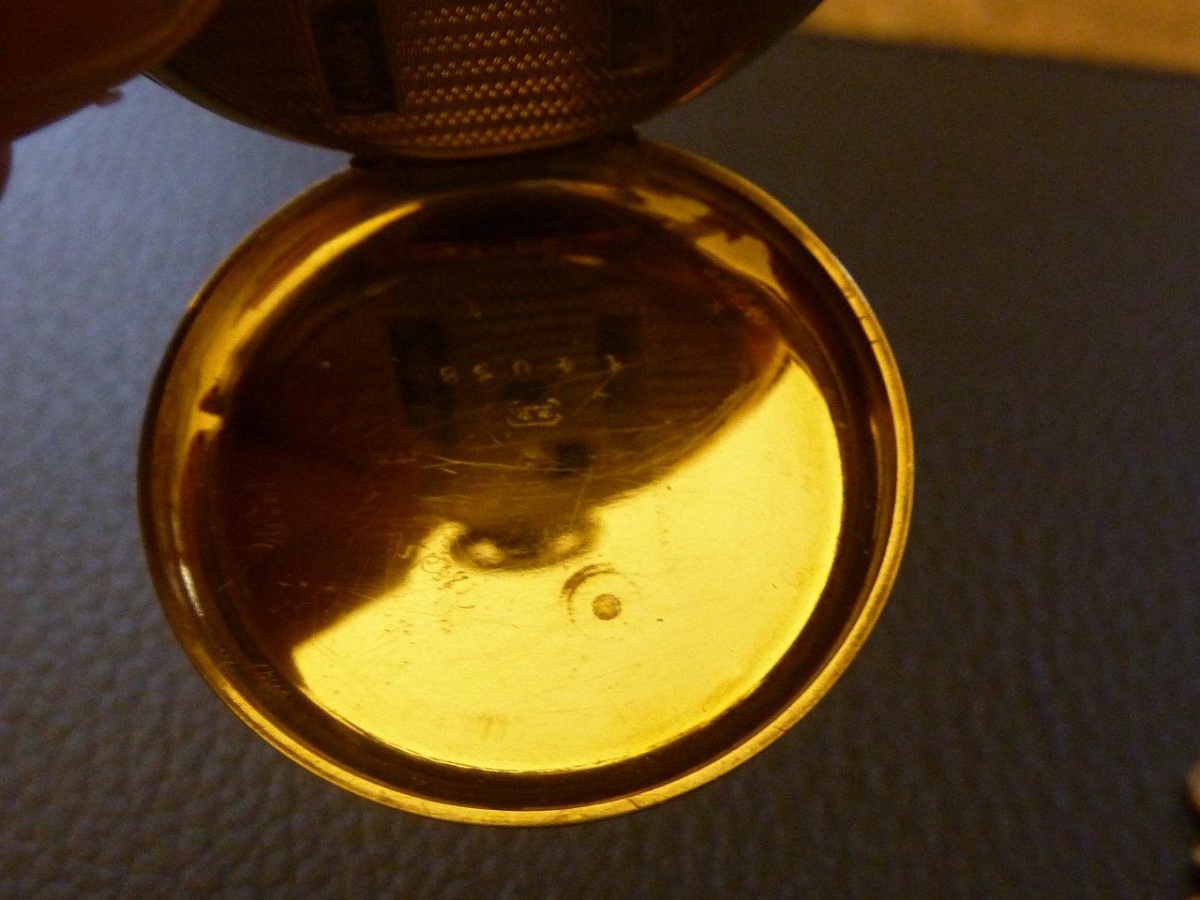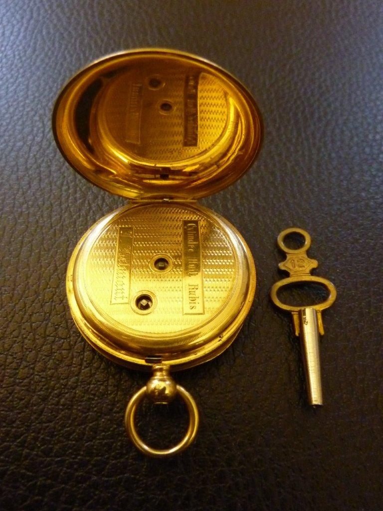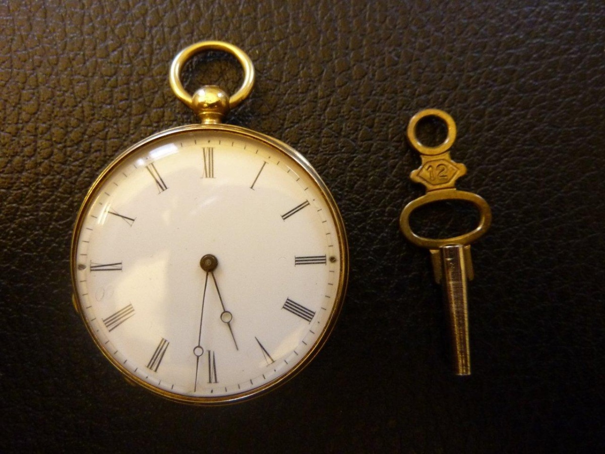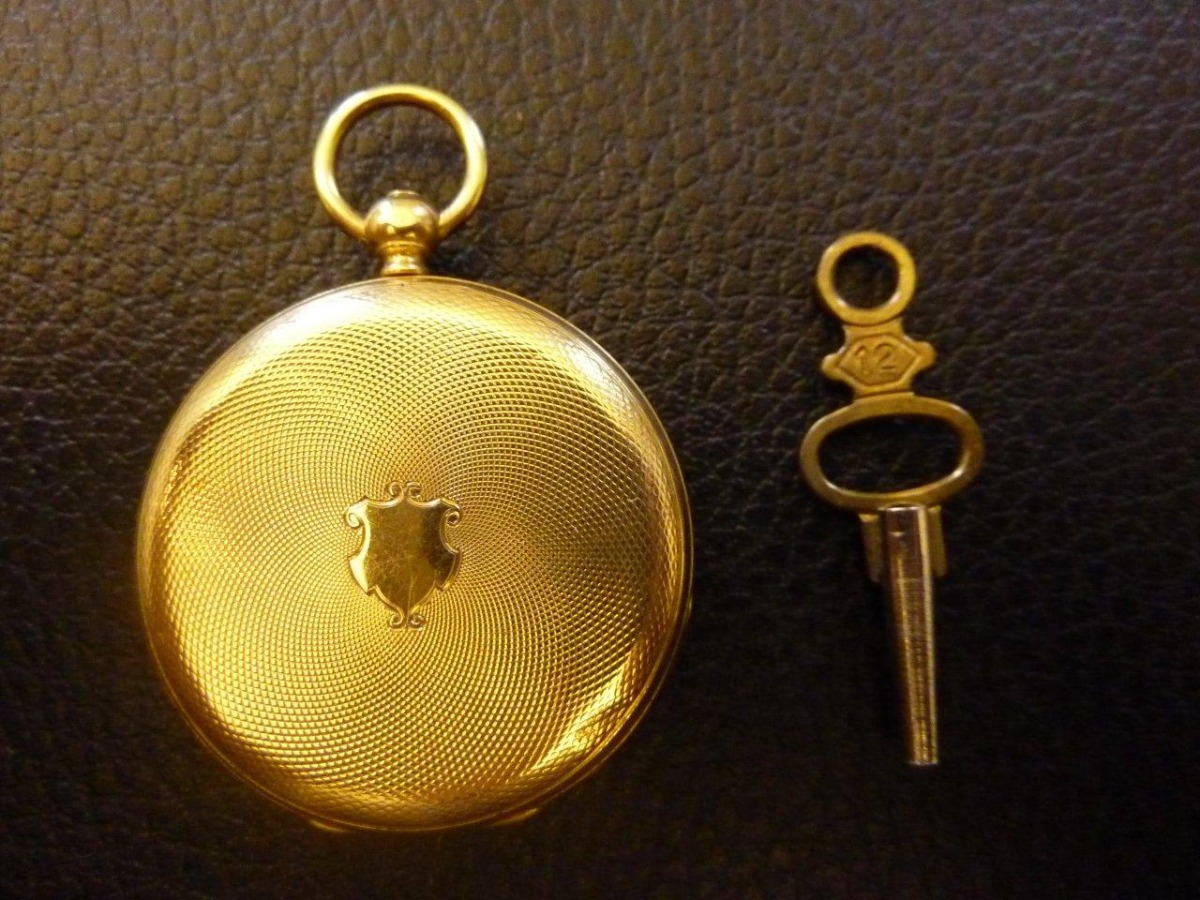 MONTRE GOUSSET en or, cylindre 8 rubis, à clé (12). Cadran émaillé à chiffres arabes. Revers guilloché à morceau de cuir. Boitier marqué J. Belmant, 14038, poinçon d'orfèvre "P.R.", tête d'aigle.