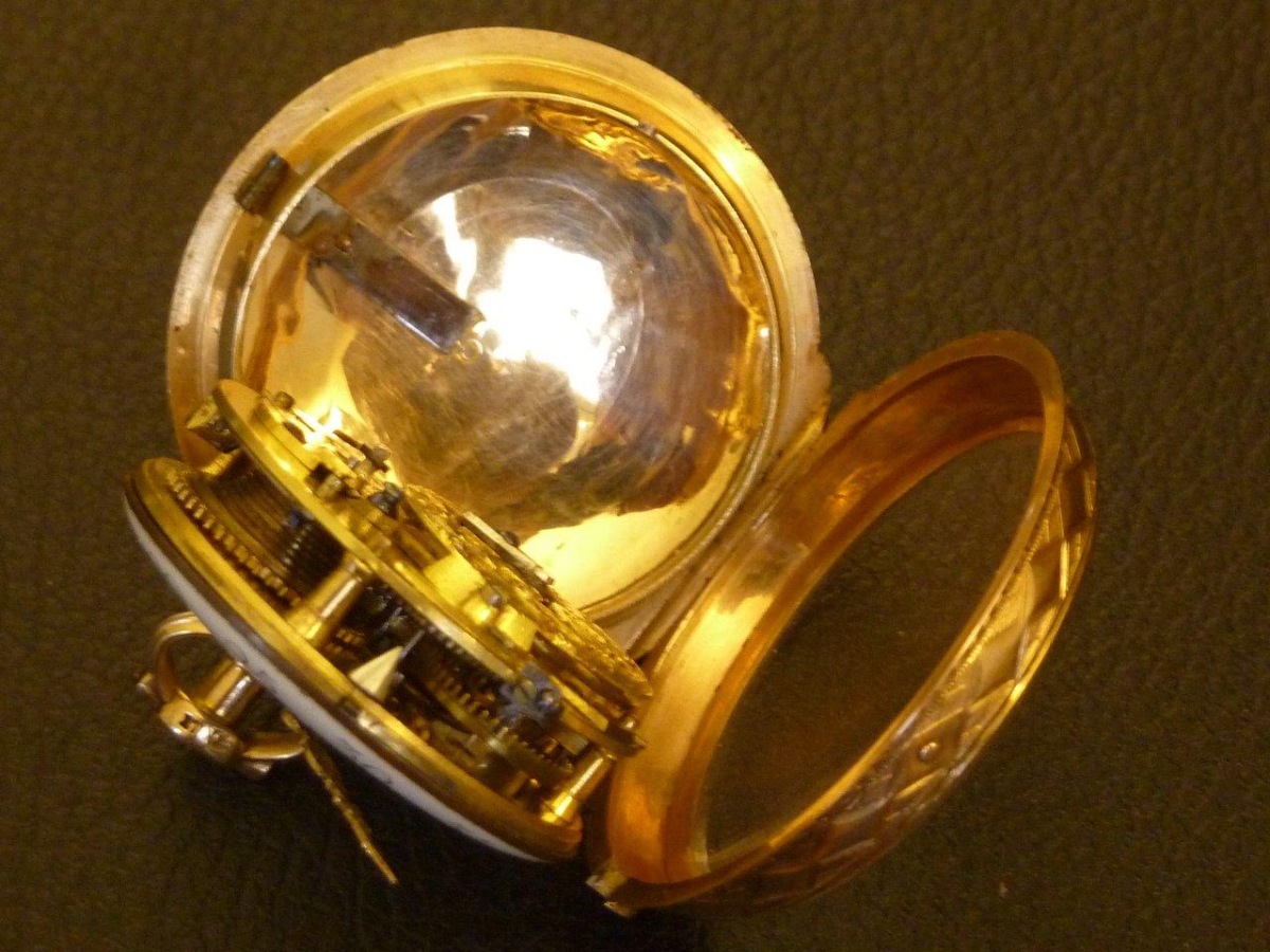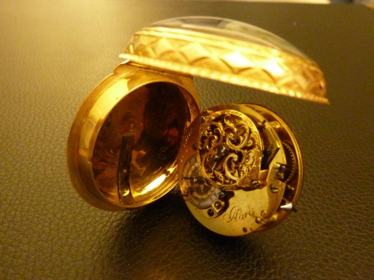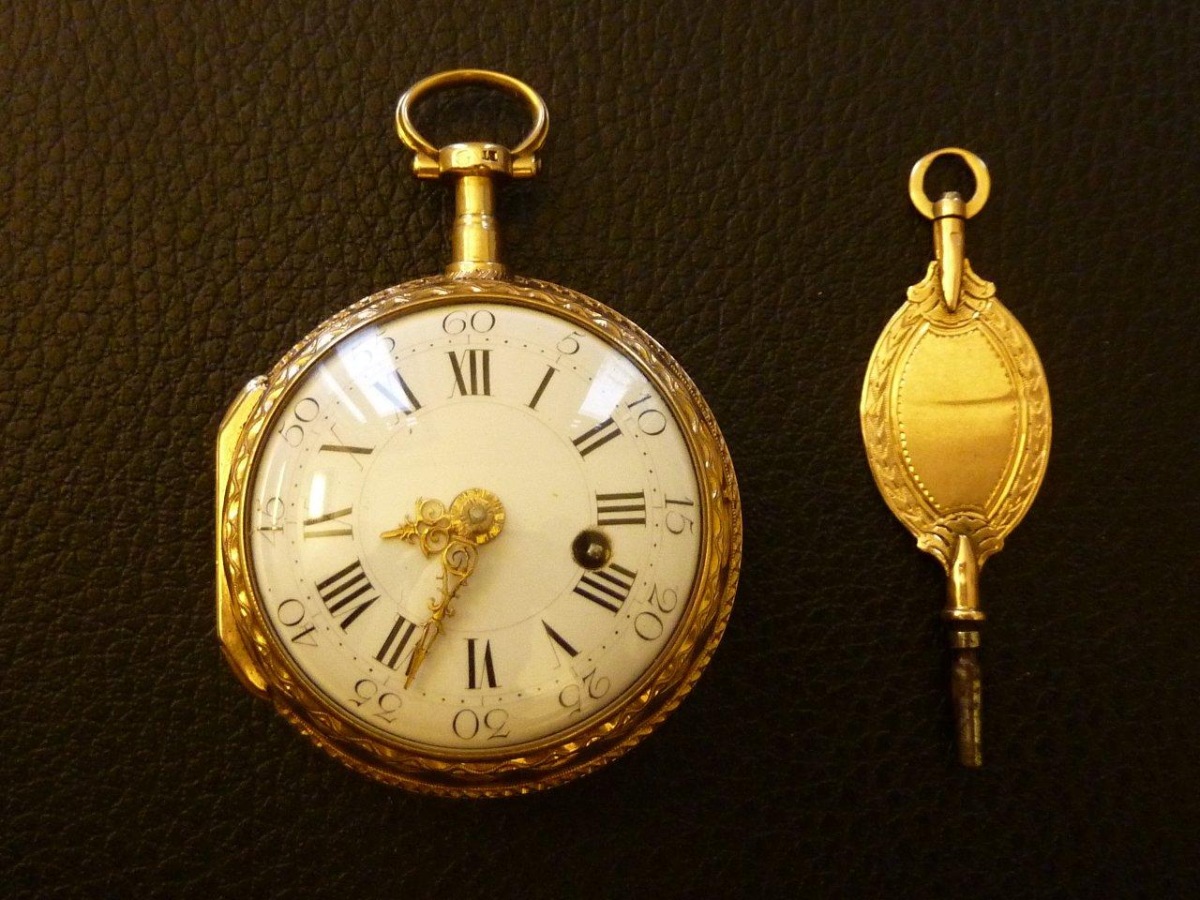 MONTRE OIGNON, boîtier en or à décor de rubans et de feuillages entourant un trophée d'instruments de musique. Cadran émaillé blanc indiquant les heures et minutes en chiffres romains et arabes. Aiguilles fleurdelysées. Décor finement ajouré de volutes sur le coq. Clef en or.