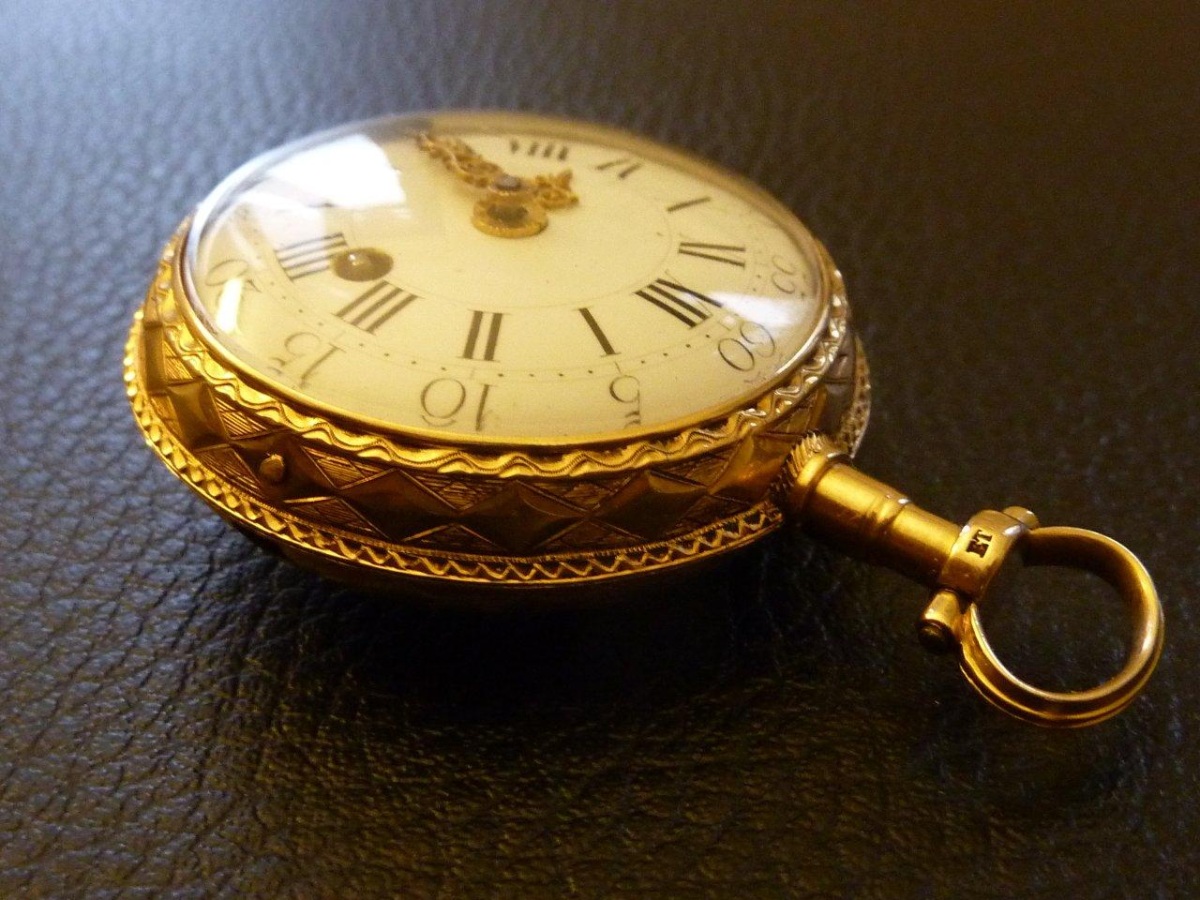 MONTRE OIGNON, boîtier en or à décor de rubans et...