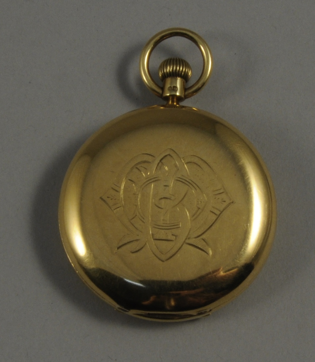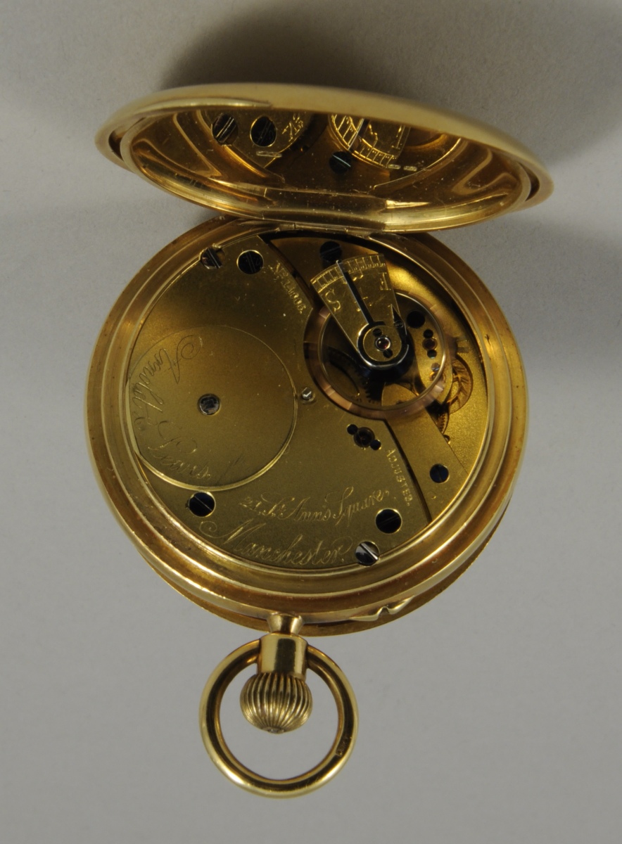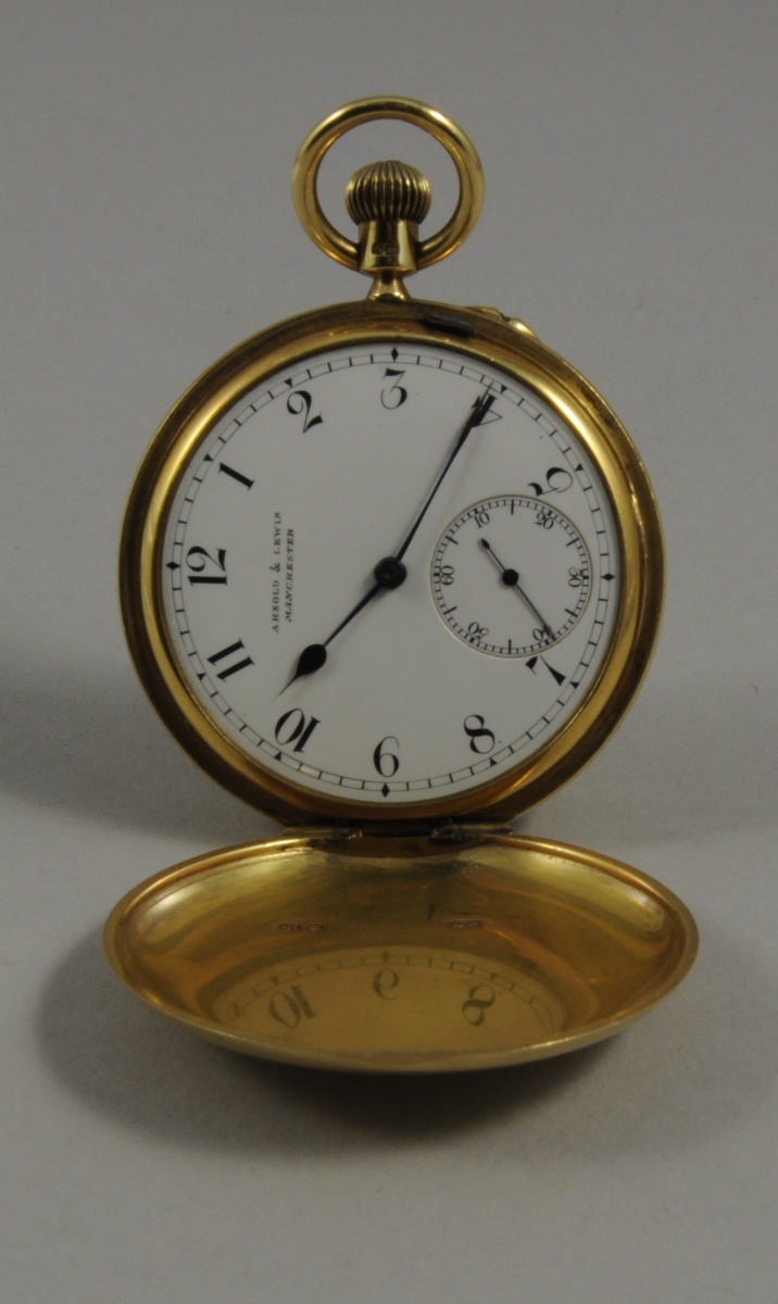 MONTRE SAVONNETTE en or. Double cadran émaillé balnc à chiffres arabes. Avers initiales gravées entrelacées. Signé Ambold et Lewis Manchester. Diam. 5 cm. Pois brut 118 g.
