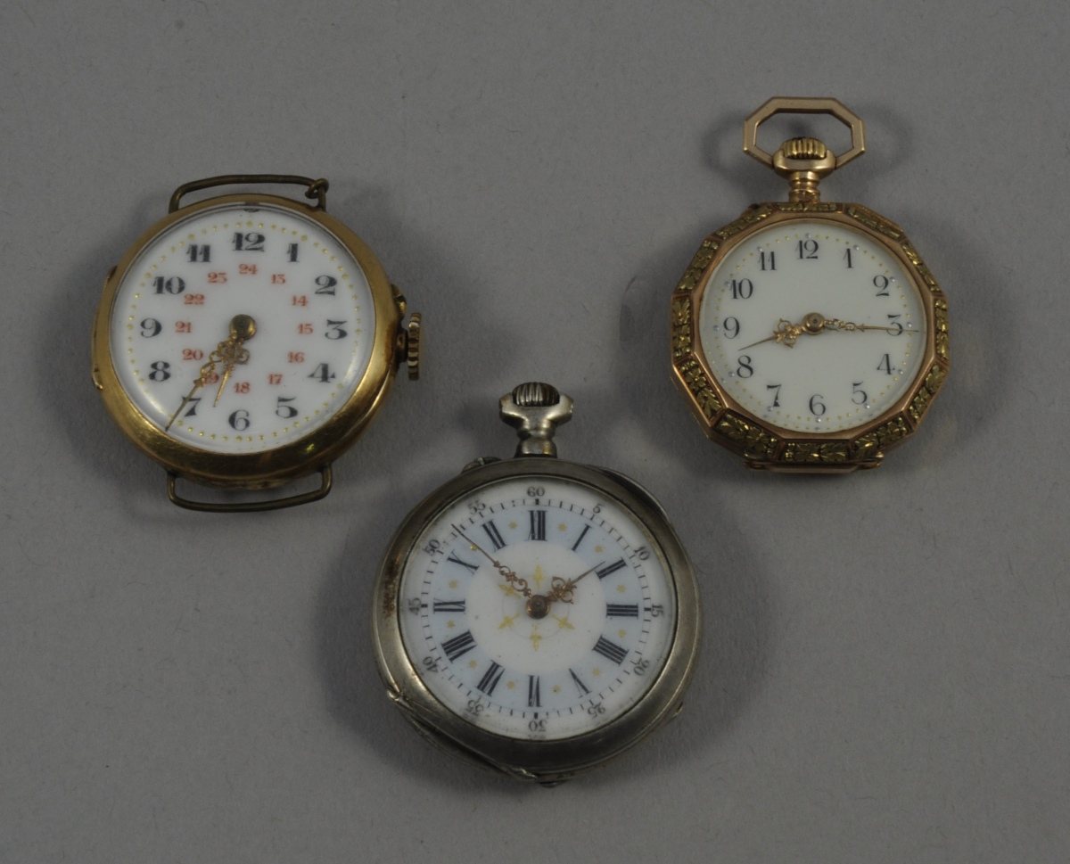 - 2 en or de 2 tons, dont 1 montée en bracelet, l'autre à pans coupés. Initiales et décor floral au dos des boitiers. Poid brut : 33,7 g.