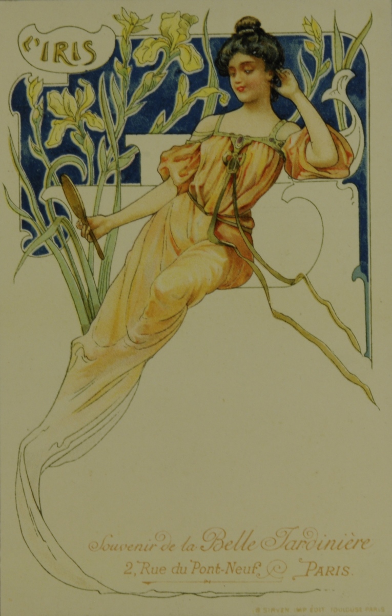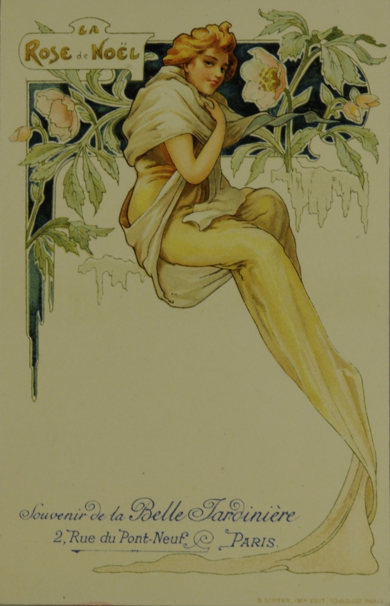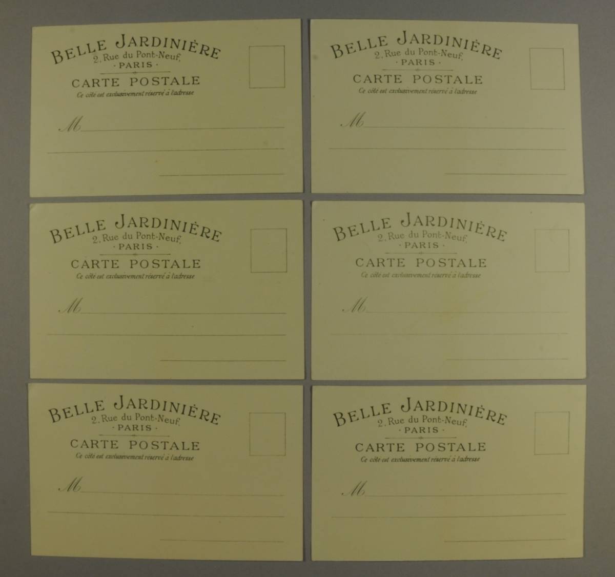 Série de 6 cartes postales en chromolithographie "Souvenir de la Belle Jardinière, 2 rue du Pont-Neuf, Paris" : "La Rose de Noël", "L'Iris", "La Glycine", "La Rose", "Le Pavot", "Chrysanthème". B. SIRVEN, Imp Edit Toulouse, Paris. Vers 1900.