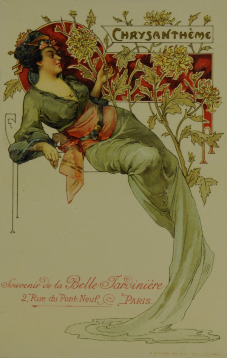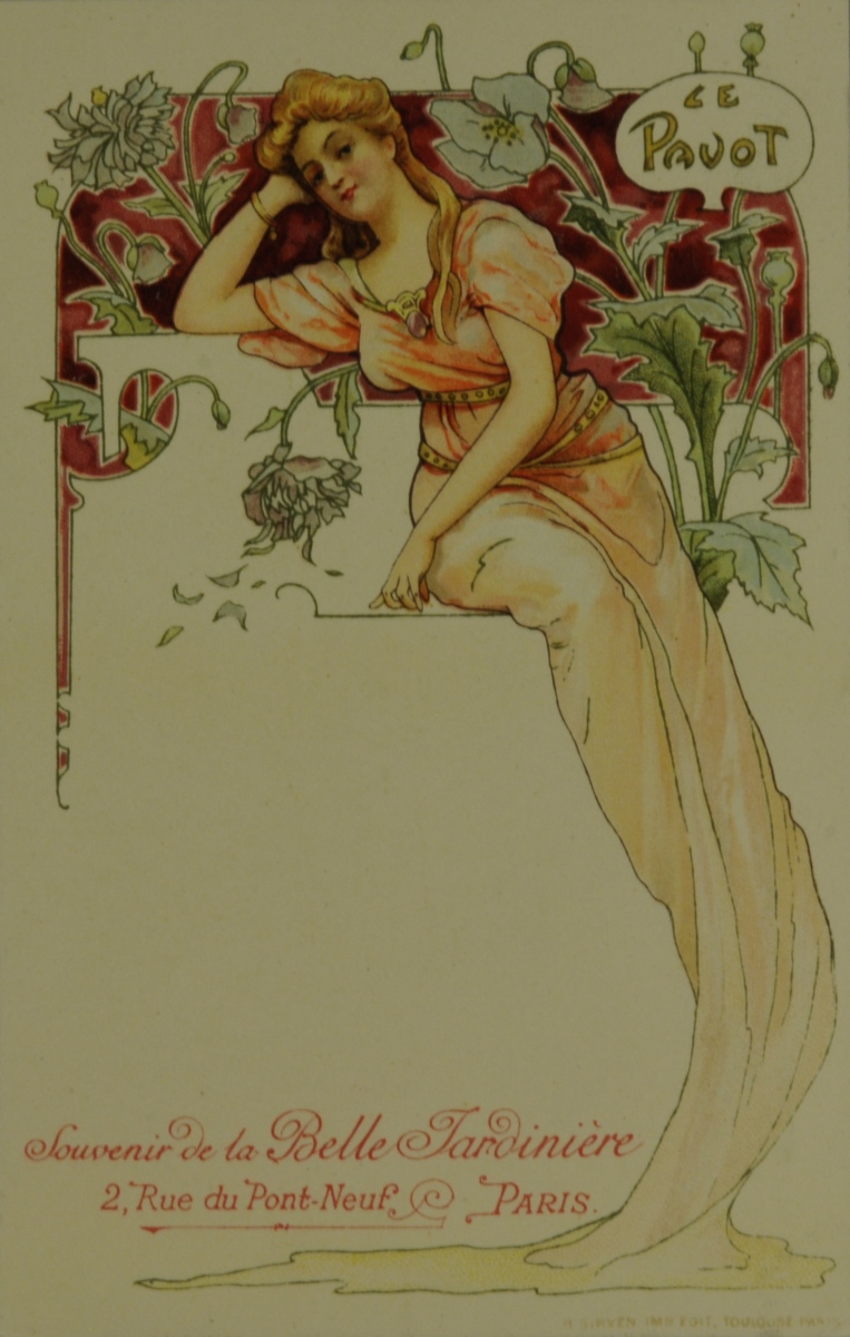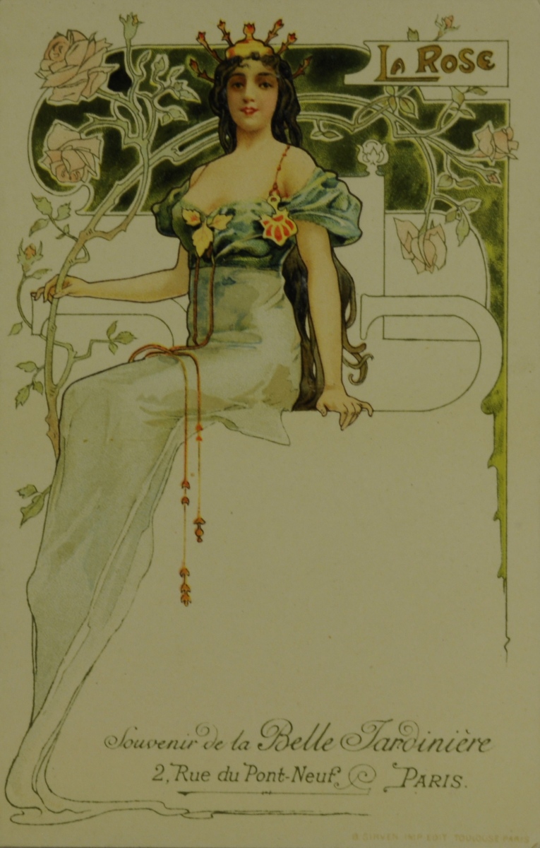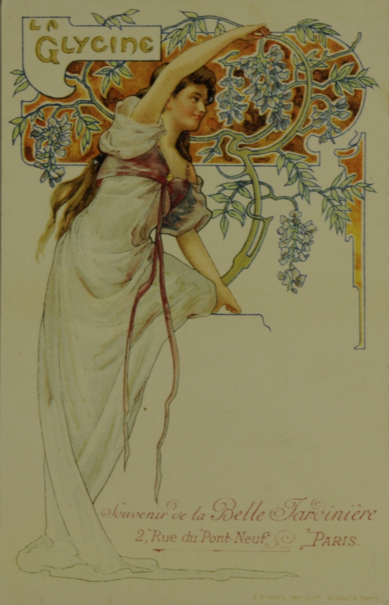 Série de 6 cartes postales en chromolithographie "Souvenir de la Belle Jardinière, 2 rue du Pont-Neuf, Paris" : "La Rose de Noël", "L'Iris", "La Glycine", "La Rose", "Le Pavot", "Chrysanthème". B. SIRVEN, Imp Edit Toulouse, Paris. Vers 1900.